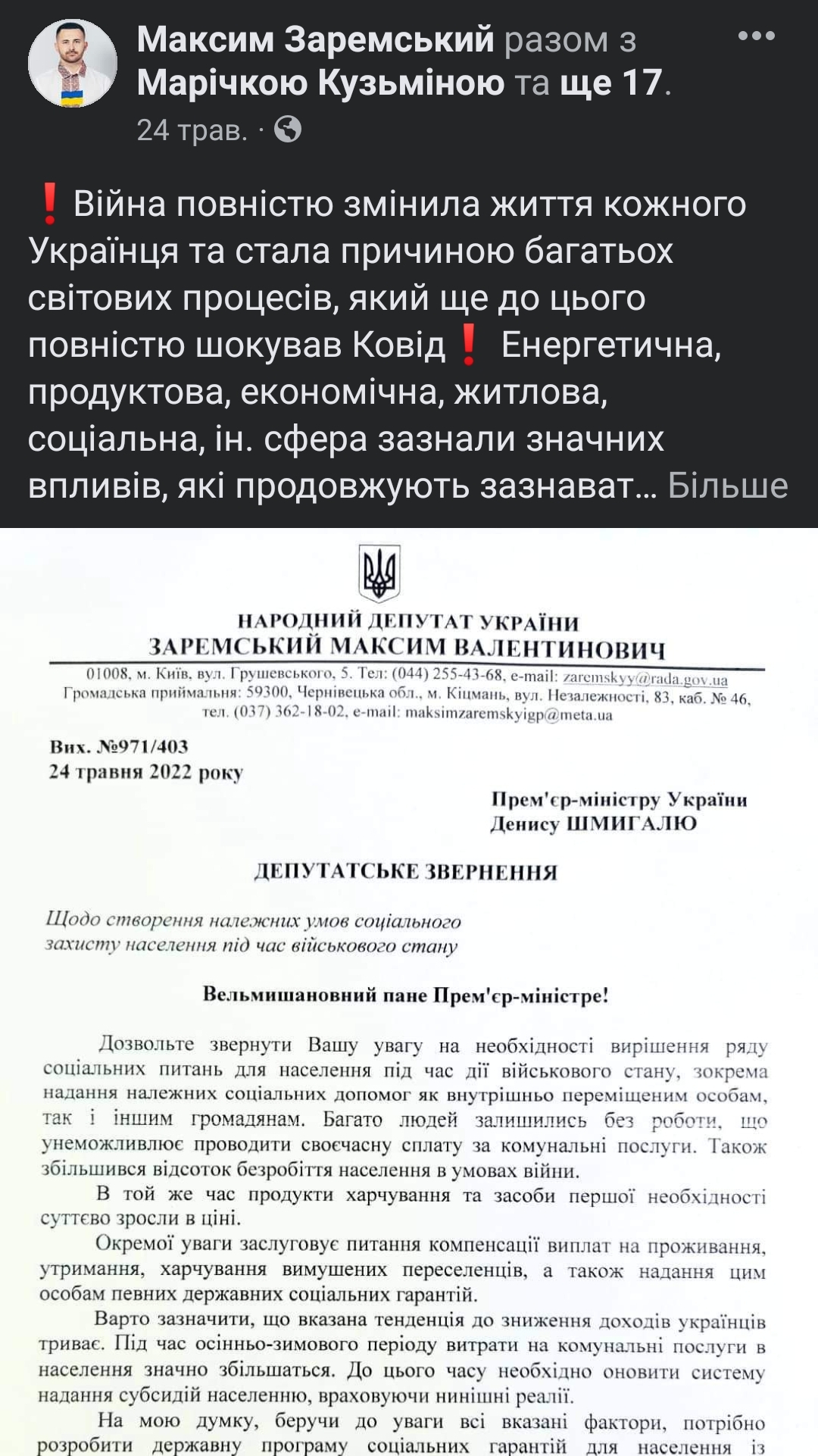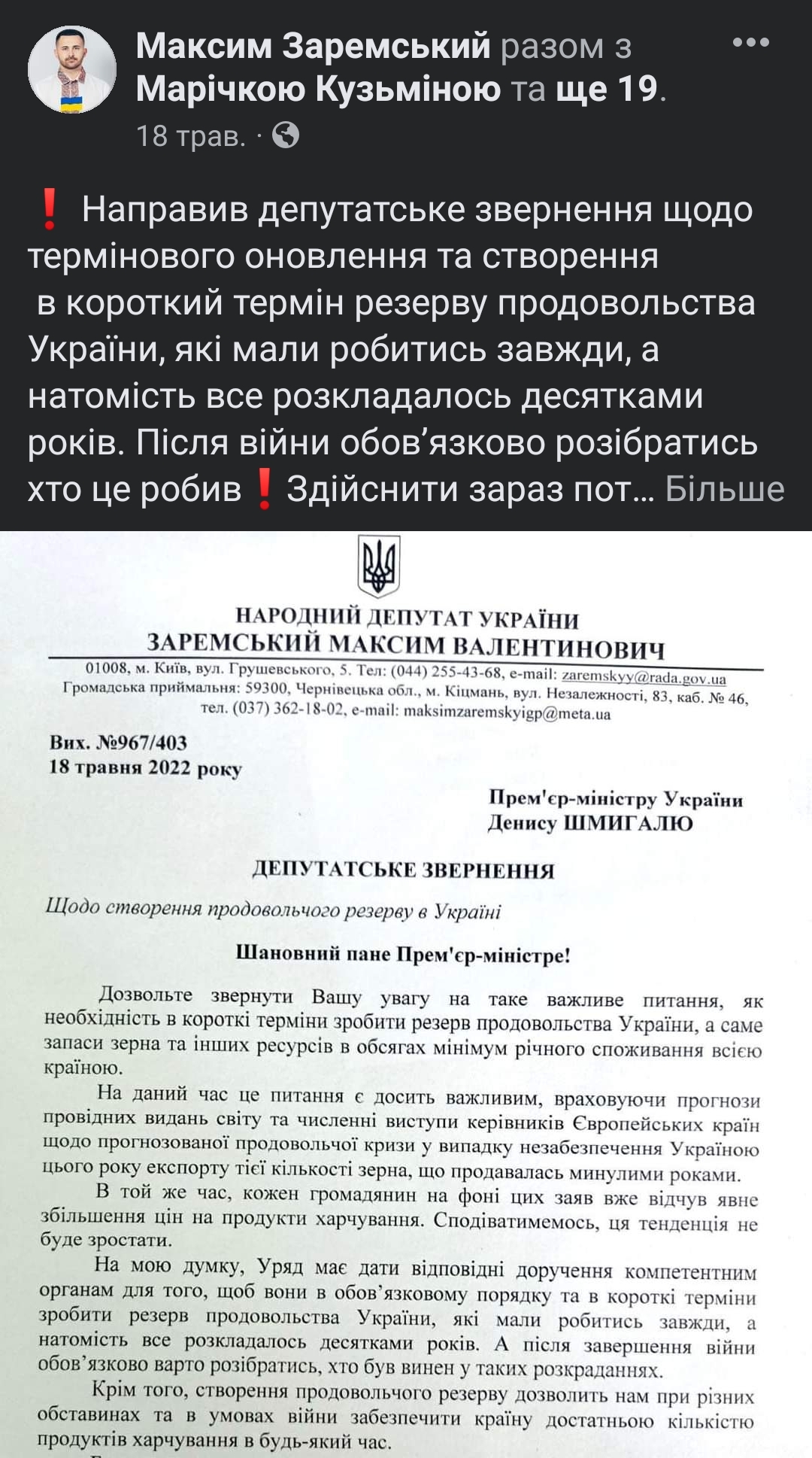 Окремими пунктом роботи, про який Максим Заремський пише на своїй сторінці, є депутатські звернення. З 24 лютого він повідомив про кілька з них: