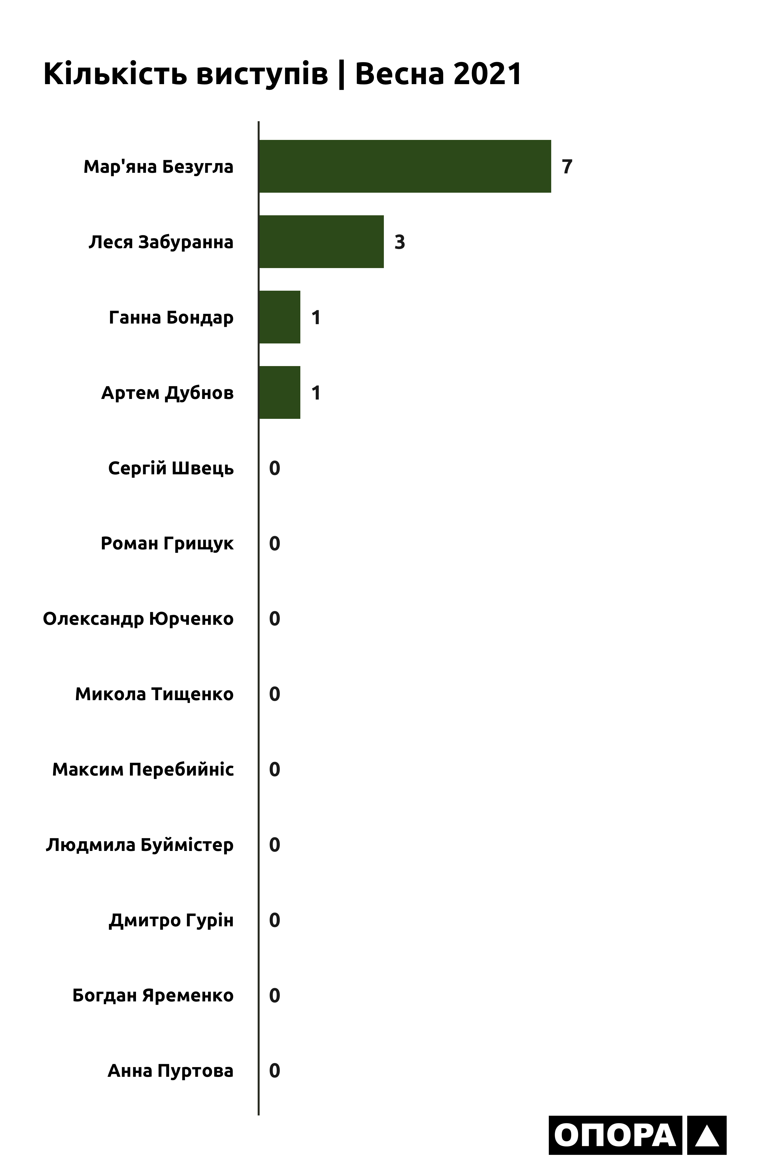 Народна депутатка Мар'яна Безугла була однією з найактивніших серед нардепів Києва. Протягом весни їй вдалося виступити 7 разів під час пленарних засідань. Загальний час всіх весняних виступів депутатки становить 11 хв 50 с. Інші три виступи здійснила Леся Забуранна, головними меседжами її виступів була підтримка законопроєктів, що стосуються економічної політики, до них відносяться: №5308 та №5197-2. Ганна Бондар скористалася своїм правом виступу у Верховній Раді для оголошення своєї позиції щодо законопроєкту №3337 про внесення змін до Закону України "Про регулювання містобудівної діяльності". Не скористався своїм правом на виступи депутат Артем Дубнов, який надане йому слово вирішив передати Павлу Фролову.
