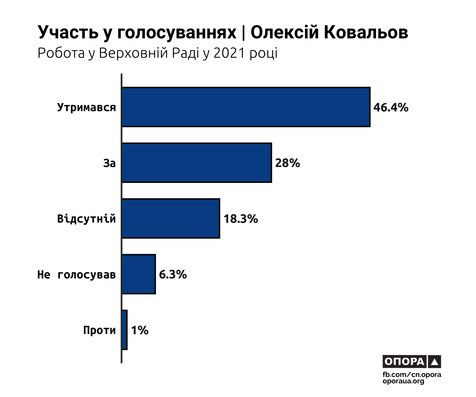 Народний депутат Олексій Ковальов, який представляє виборчий округ №186, протягом 2021 року взяв участь у понад 80% голосувань, пропустивши 18,3% з них. У 28% випадків нардеп голосував «За», в 1% випадків — «Проти», у 46,4% випадків — «Утримався». Водночас він не голосував у 6,3% випадків.