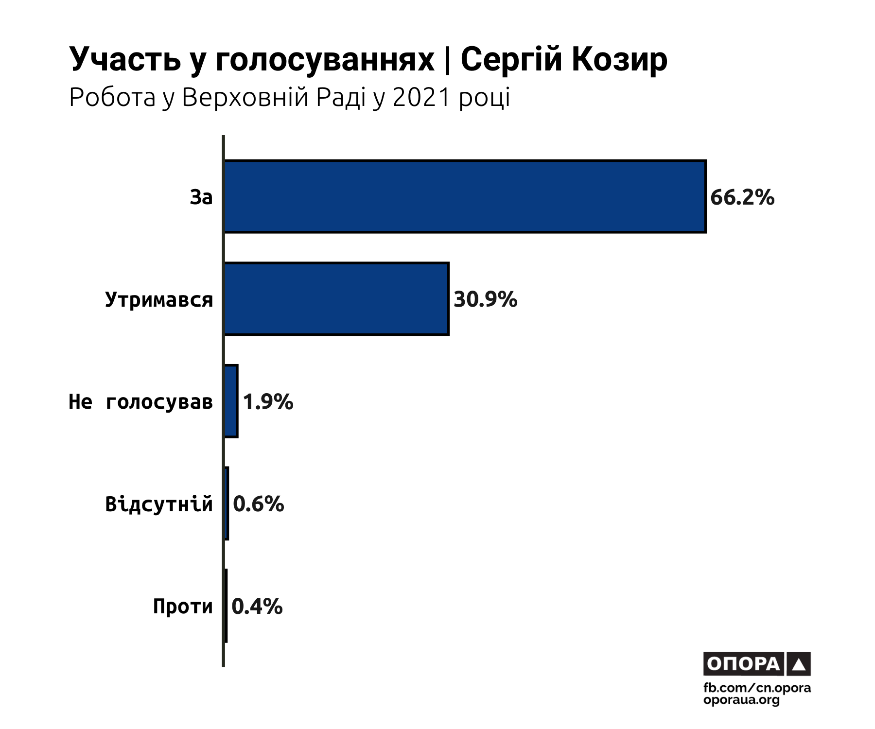 Проаналізувавши голосування народного депутата за допомогою платформи «Вони голосують за тебе», ОПОРА виявила у Сергія Козиря 1,5% голосувань «проти лінії» фракції «Слуга народу».