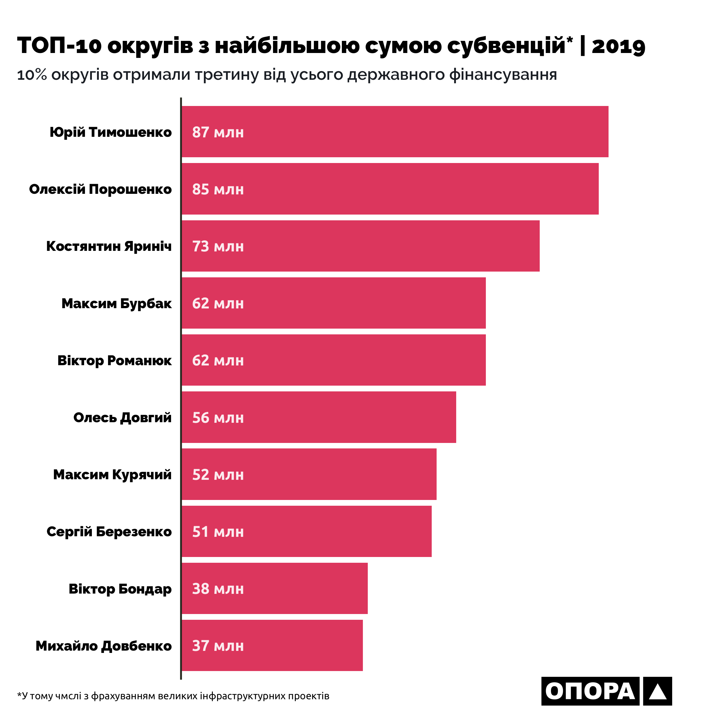 Так, у 2019 році найбільшу кількість субвенцій отримав мажоритарний округ №161 (Сумська область) Миколи Лаврика – 293. Округ №198 (Черкаська область) Сергія Рудика – 289 субвенцій, округ №198 (Житомирська область) Павла Дзюблика одержав 266 субвенцій, а округ №167 Олега Барни – 242. Понад 200 субвенцій також одержали: округ №202 (Чернівецька область, у ВР представляв Іван Рибак), округ №130 (Миколаївська область, у ВР представляв Андрій Вадатурський) та округ №127 (Миколаївська область, у ВР представляв Борис Козир).
