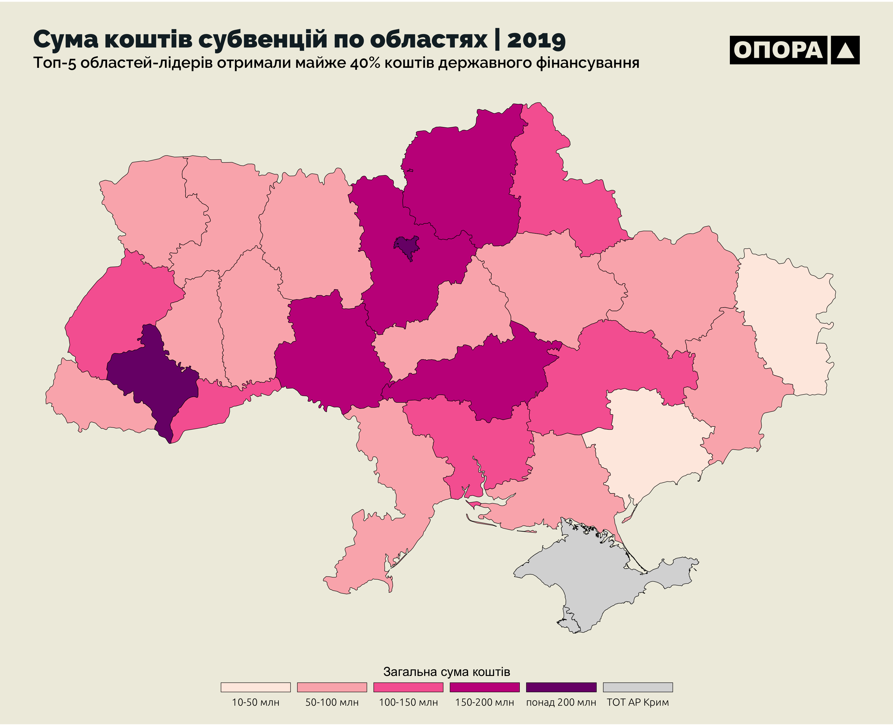 ОПОРА проаналізувала, які області отримали найбільшу та найменшу кількість коштів у рамках розподілу субвенцій на соціально-економічний розвиток у 2019 році. Так, у порівнянні з минулорічним дослідженням, лідируючі позиції втратили Вінницька та Харківська області. Натомість у п’ятірку лідерів уперше увійшли Кіровоградська область та м. Київ. Загалом список областей, які отримали найбільше субвенцій у 2019 році, виглядає так: у Івано-Франківську область було спрямовано 288 мільйонів гривень (10,6% від загальної суми виділених субвенцій), до м. Києва – 254,5 (9,3%), Кіровоградську – 188,7 (6,9%), Вінницьку – 180,8 (6,6%), Чернігівську – 163 (6%). Нескладно підрахувати, що 5 областей зі списку отримали майже 40% коштів з державного фінансування.