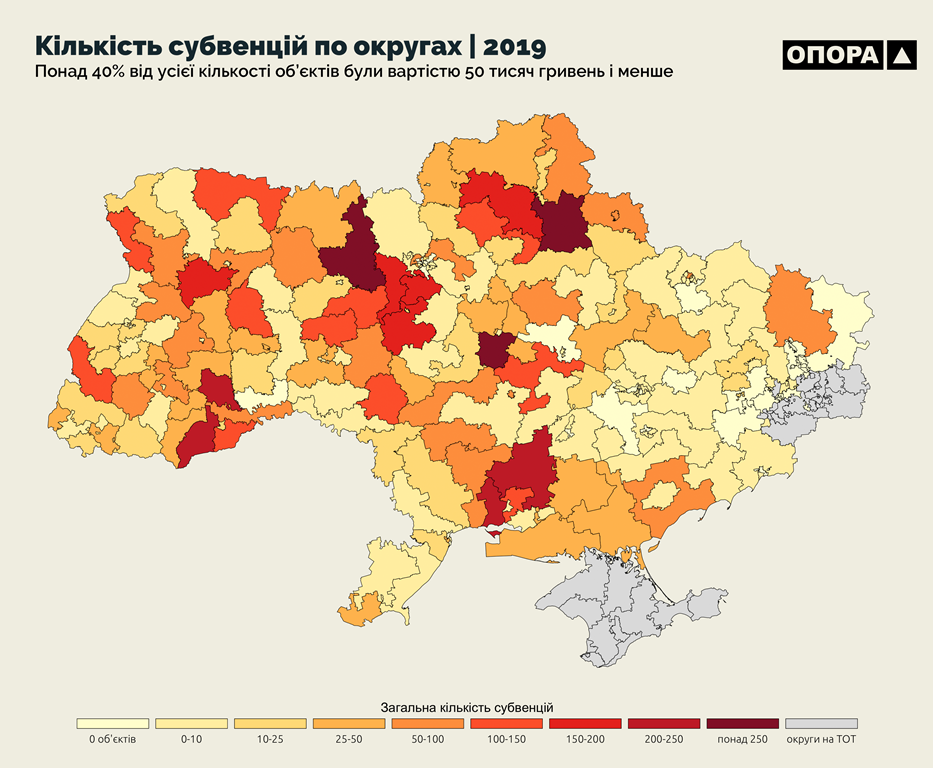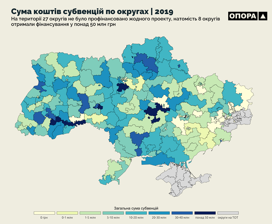 Так, у 2019 році 27 округам не виділили коштів зовсім, 6 округів отримали менше одного мільйона гривень державного фінансування, натомість ще 50 виборчих округів було профінансовано на суму від одного до п’яти мільйонів гривень. Таким чином, уже вчергове майже третина округів недоотримують коштів державних субвенцій.