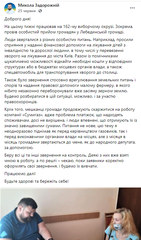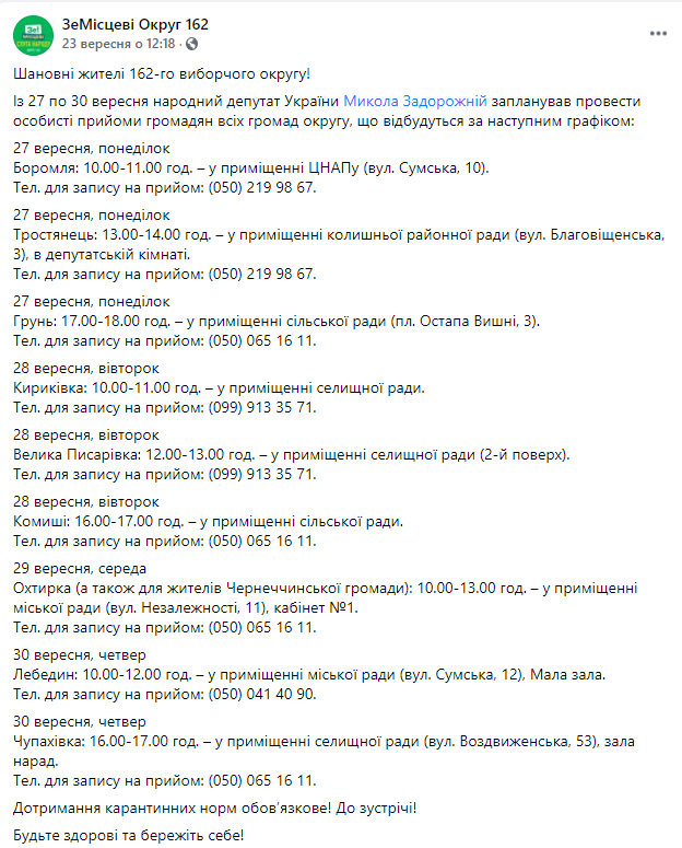 Микола Задорожній також має постійну приймальню в центрі свого 162 виборчого округу – в місті Охтирка. Приймальня працює у приміщенні міської ради, за адресою вул. Незалежності, 11, каб. 13. Прийом має вестись по понеділках і середах з 09:00 до 12:00. Крім того, депутат активно зустрічається з виборцями і проводить особистий прийом в інших населених пунктах свого округу. Графік та місця, де можна зустрітись із депутатом, оприлюднює сам народний обранець та місцева партійна сторінка. Микола Задорожній ретельно звітує про зустрічі з виборцями та про питання, які на них піднімались, на своїй сторінці у соціальній мережі.