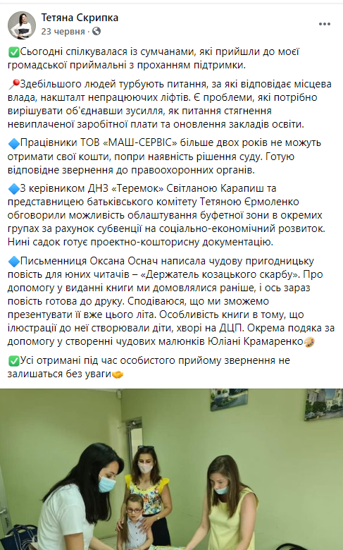 Тетяна Скрипка (Рябуха) була обрана від «міського» 157 округу, тому у створенні великої мережі громадських приймалень для зустрічей з виборцями у неї немає потреби. Її приймальня працює у місті Суми на вулиці Металургів, 4. Особистий сайт депутатки дає можливість залишити звернення онлайн. Про основні проблеми, з якими до неї звертаються під час особистого прийому, Тетяна Скрипка звітує в соціальних мережах.