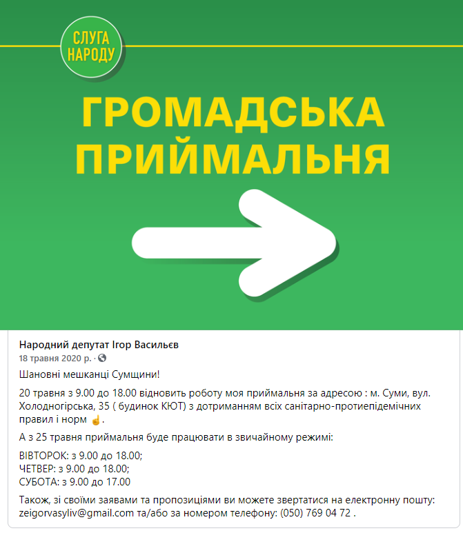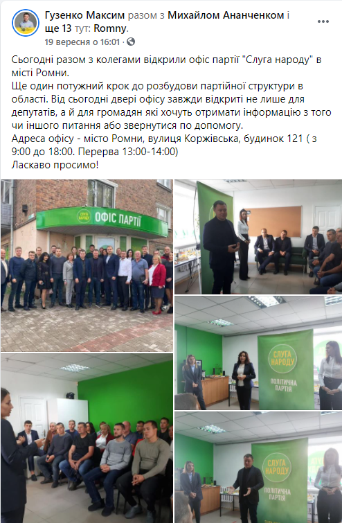 Зокрема, приймальня «Слуги народу» працює в місті Суми на вулиці Гагаріна, 11 (стадіон «Ювілейний»). Нещодавно також відбулось відкриття партійного офісу в Ромнах (вулиця Коржівська, 121), який працюватиме також і як громадська приймальня.