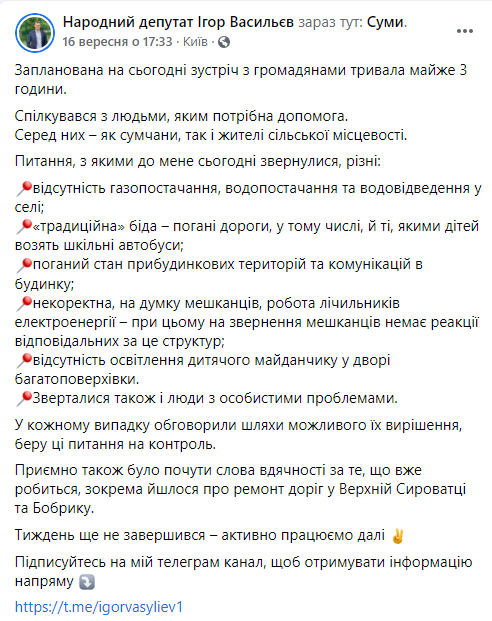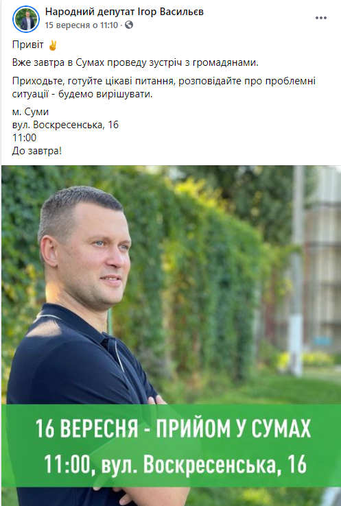 Ігор Васильєв, обраний від 158 виборчого округу, також має громадську приймальню в Сумах. Спочатку особистий прийом громадян депутат вів на вулиці Холодногірській, 35. Відповідно до рішення Сумської міської ради 5790-МР від 21.10.2019, депутат орендував це приміщення за 2 гривні на місяць. Проте згодом Ігор Васильєв обрав інше приміщення – на вулиці Воскресенській, 16. Депутат повідомляє про дні особистого прийому у соціальних мережах та звітує про проблеми, що на таких зустрічах обговорювались.