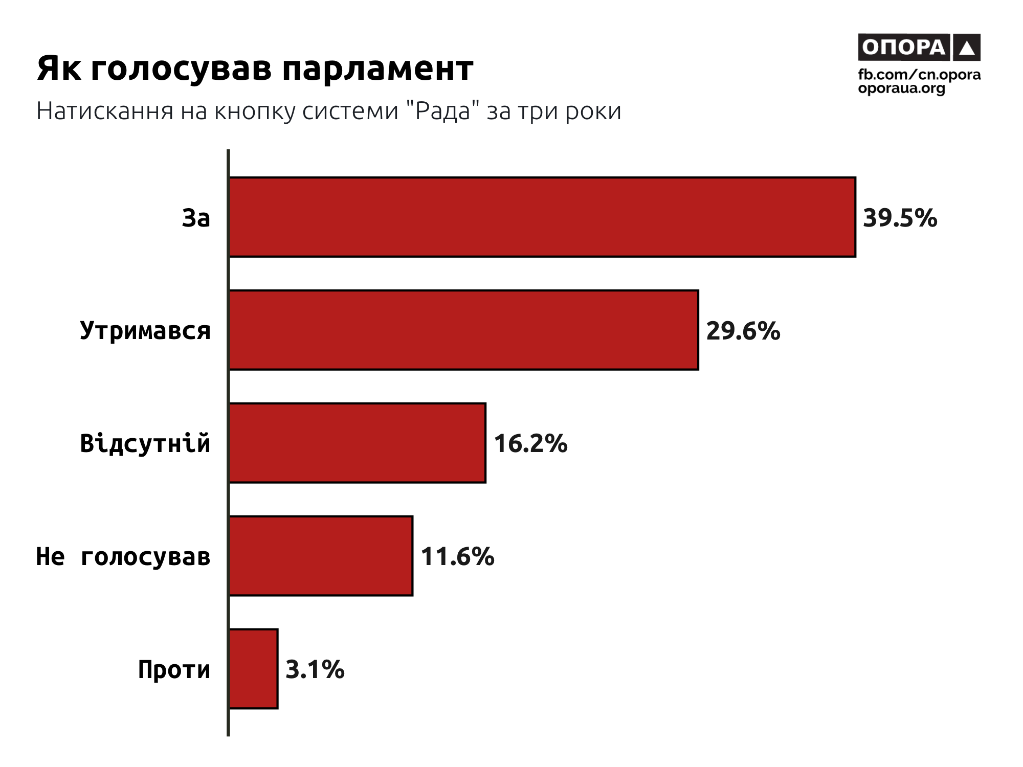 Найчастіше в парламенті голосують “за” — 39,5% та “утримався” — 29,6%. Натомість майже не голосують “проти” — 3,1%.