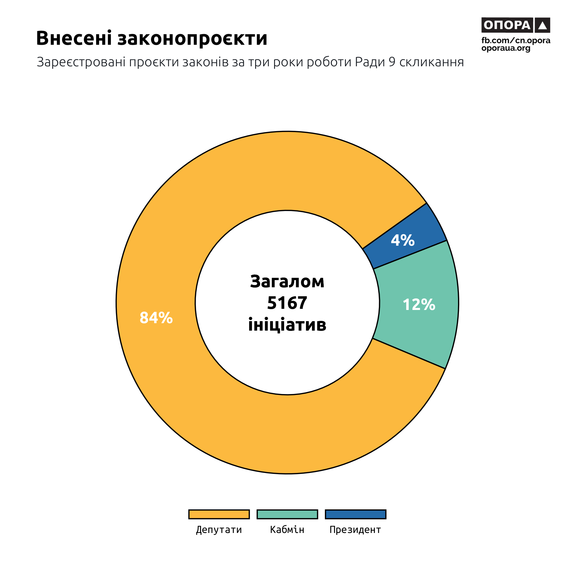За три роки роботи в парламенті зареєстрували 5167 законопроєктів. Найрезультативнішими в цьому контексті були народні депутати — 4330 ініціатив (83,8%). На другому місці — Кабмін із 633 законопроєктами (12,3%), далі – Президент, який подав 204 ініціативи (3,9%). Однак найбільш ефективним виявився саме Президент.