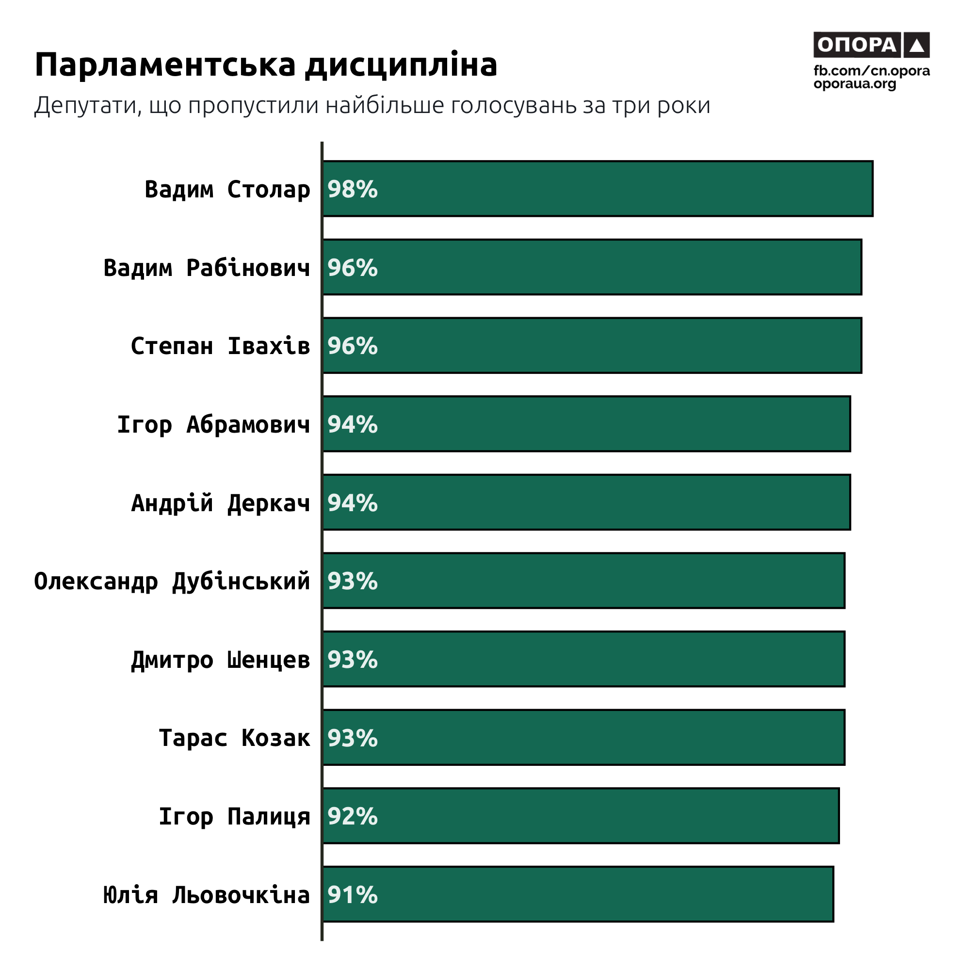 Лідерами за кількістю пропущених голосувань є Вадим Столар (тепер — група "Відновлення України"), який не голосував у 98% випадків. На другому місці — його ексколега по фракції “ОПЗЖ” Вадим Рабінович (96,3%). На третьому — член групи "За майбутнє" Степан Івахів — 96,2%.