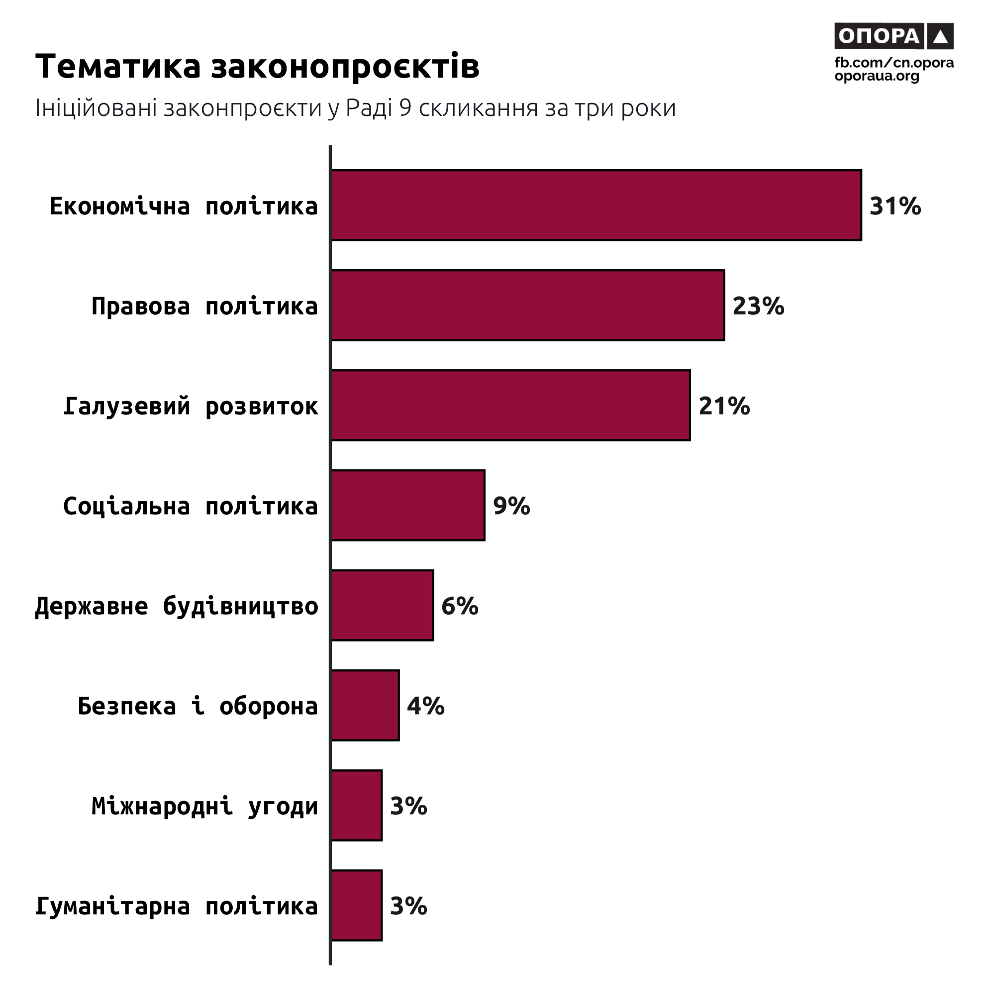 Головними темами, над якими працювали законодавці, стали економічна політика — 31,2% (1612), правова політика — 22,8% (1177) та галузевий розвиток — 20,5% (1058). Значно менше законодавці працювали у царинах соціальної політики — 9,3% (483), державного будівництва — 6,3% (323) та безпеки й оборони — лише 3,8% (197). На міжнародні угоди та гуманітарну політику припало по близько 3% ініціатив: 162 та 155 законопроєктів відповідно.