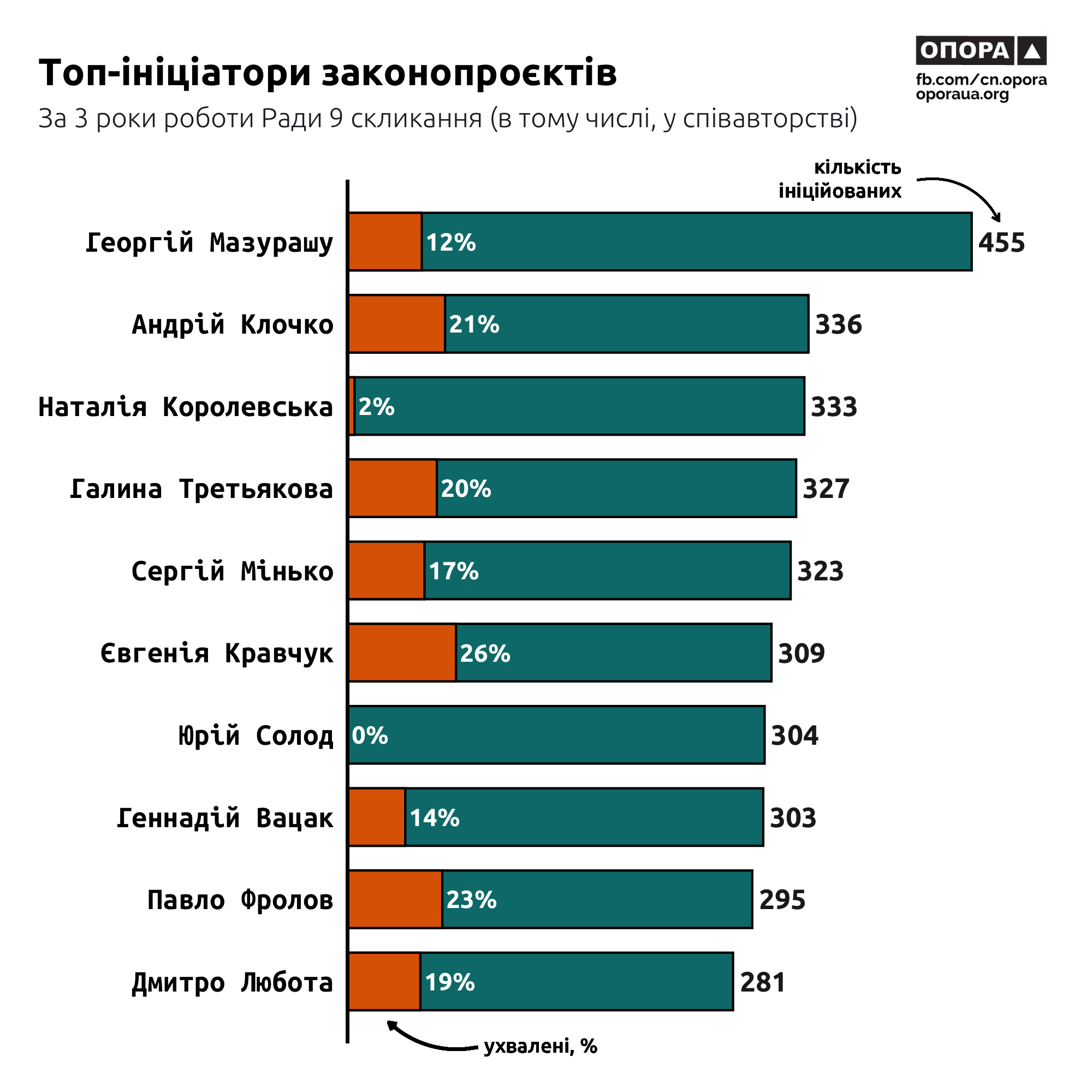 Якщо говорити лише про кількісний показник ухвалених ініціатив, то лідерами будуть депутати з монобільшості: Данило Гетманцев — 91, Євгенія Кравчук — 79, Олександр Бакумов — 73, Андрій Клочко — 71 і Тетяна Скрипка — 70.