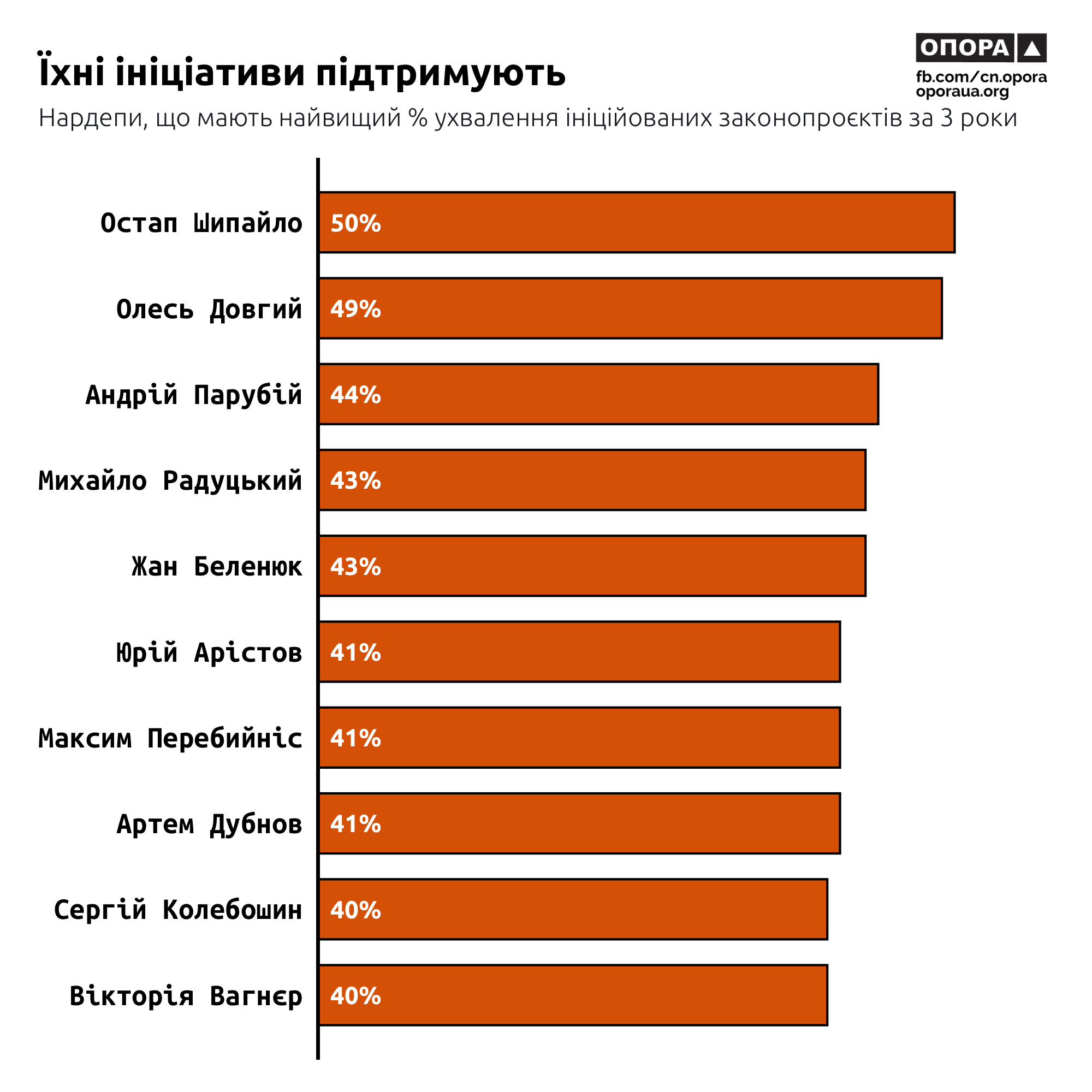 Найбільший відсоток ухвалення законів має Остап Шипайло зі “Слуги народу” — 50% його ініціатив стали законами. (13 з 26). Далі за цим показником — позафракційний Олесь Довгий із 48,6% (17 з 35), Андрій Парубій із “ЄС” — 44,4% (4 з 9) та кілька депутатів зі "Слуги народу": Жан Беленюк — 43,3% (13 з 30), Михайло Радуцький — 42,6% (52 з 122), Артем Дубнов — 40,1% (39 з 95), Максим Перебийніс — 40,7% (33 з 81), Юрій Арістов — 40,6% (13 з 32), Сергій Колебошин — 40% (28 з 70) та Вікторія Вагнєр — 39,6% (38 з 96).
