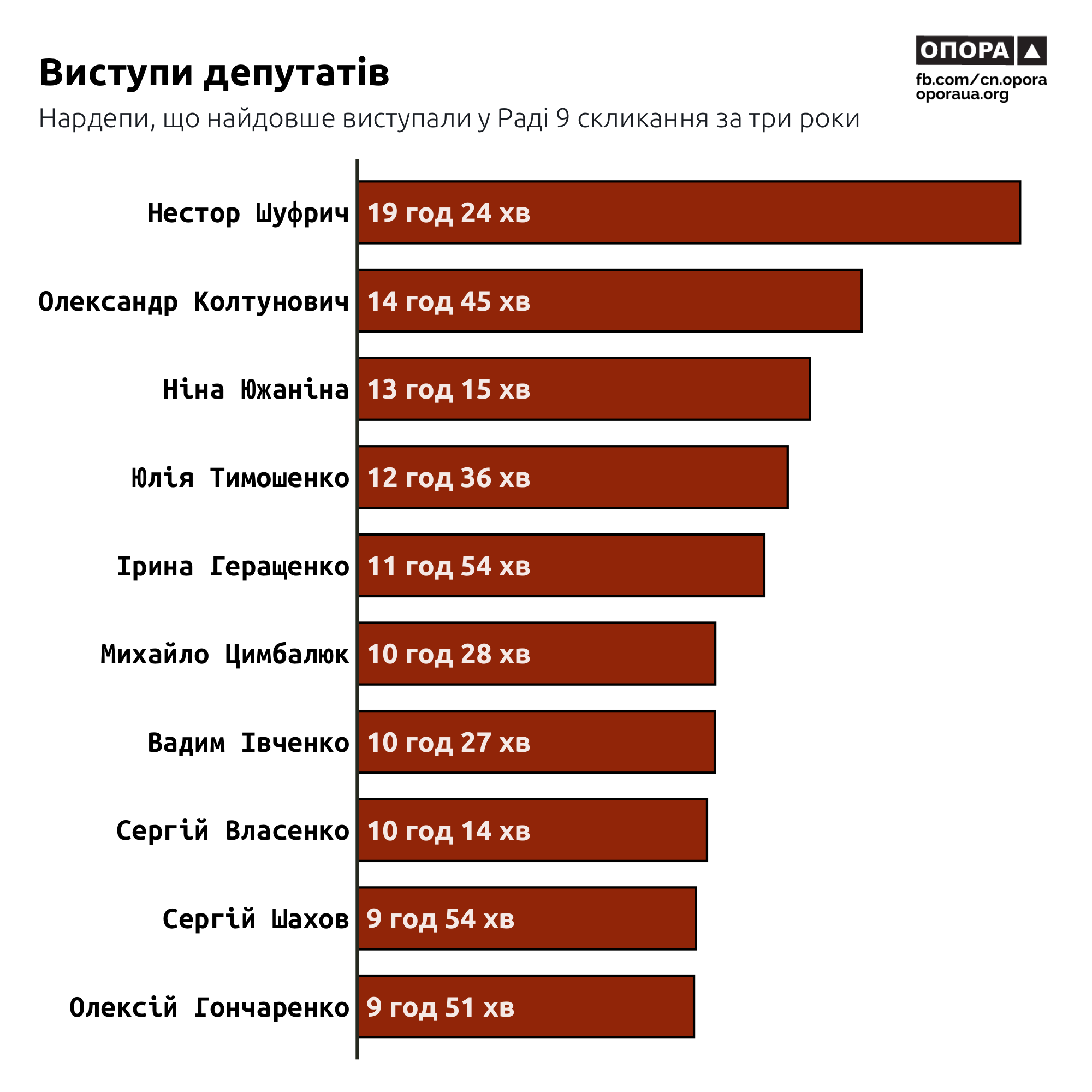 Парламентар, який виступав найбільше, загалом “наговорив” 19 годин та 24 хвилини. Ним виявився Нестор Шуфрич, який нині входить до групи “Платформа за життя та мир”. Загалом він виступав 895 разів. Другим за цим показником став ще один депутат із нині “Платформм за життя та мир” Олександр Колтунович. Тривалість його виступів становить 14 годин та 45 хвилин. На третьому місці — депутатка від “Європейської Солідарності” Ніна Южаніна. Опозиціонерка виступала 13 годин 15 хвилин. Четверте місце посіла лідерка ВО “Батьківщина” Юлія Тимошенко — 12 годин 36 хвилин. Замикає п'ятірку лідерів Ірина Геращенко — 11 годин 55 хвилин.