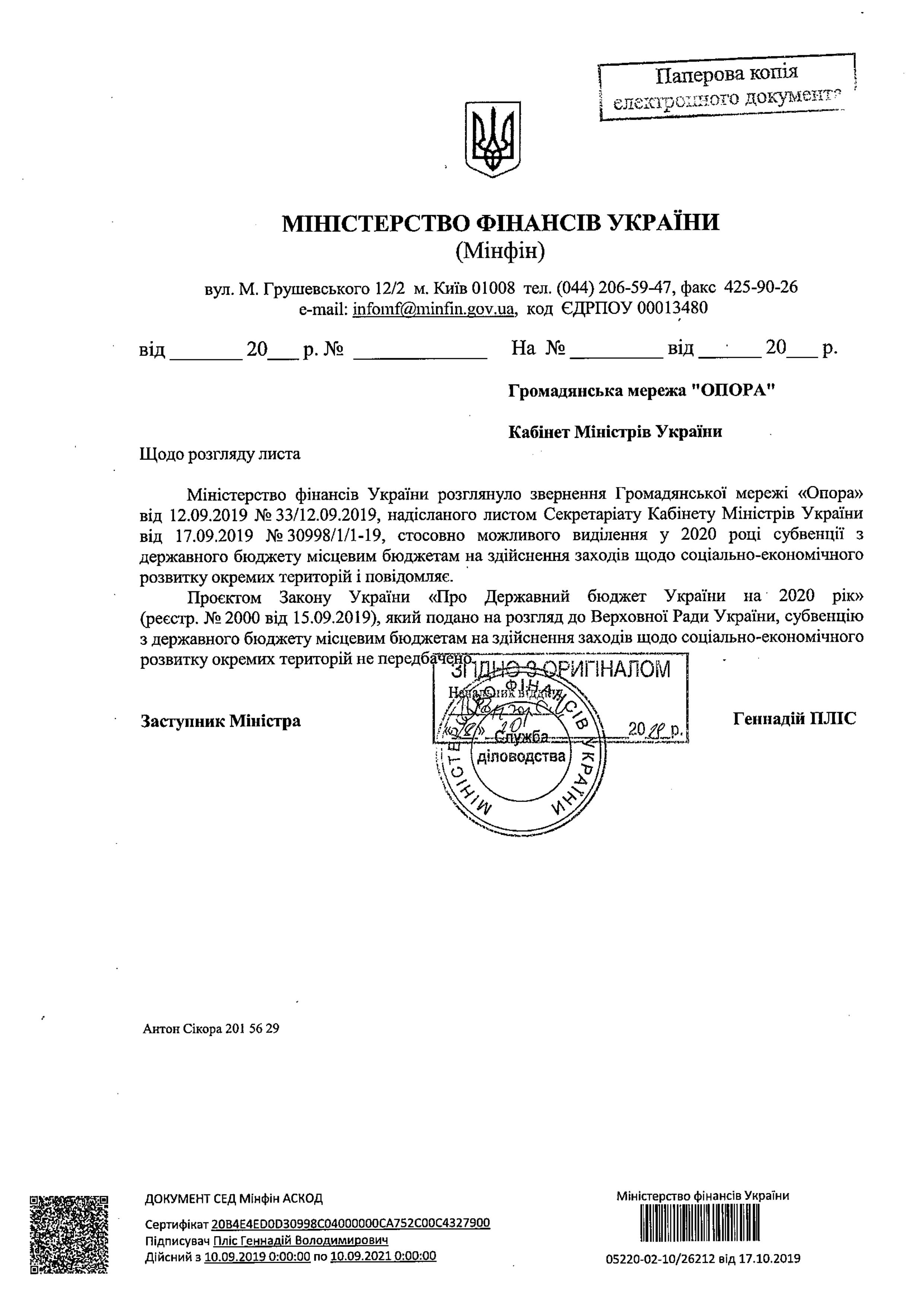 Нещодавно ОПОРА направила лист до Кабміну та Мінфіну з пропозицією зустрітися та спільно напрацювати прозорі механізми розподілу державних субвенцій на 2020 рік. На що з Мінфіну нам відповіли, що проєктом бюджету на 2020 рік субвенції на соцеконом не передбачені.