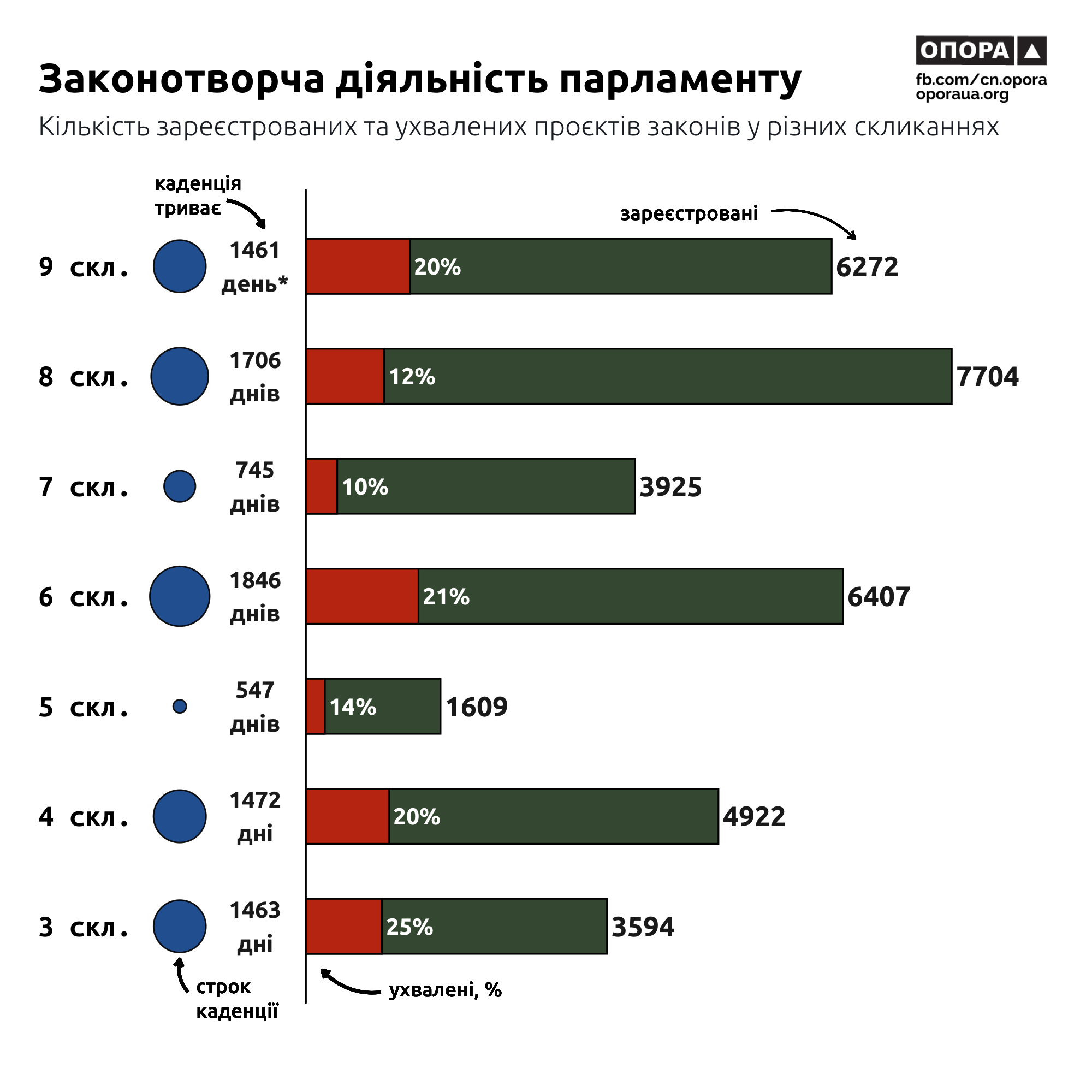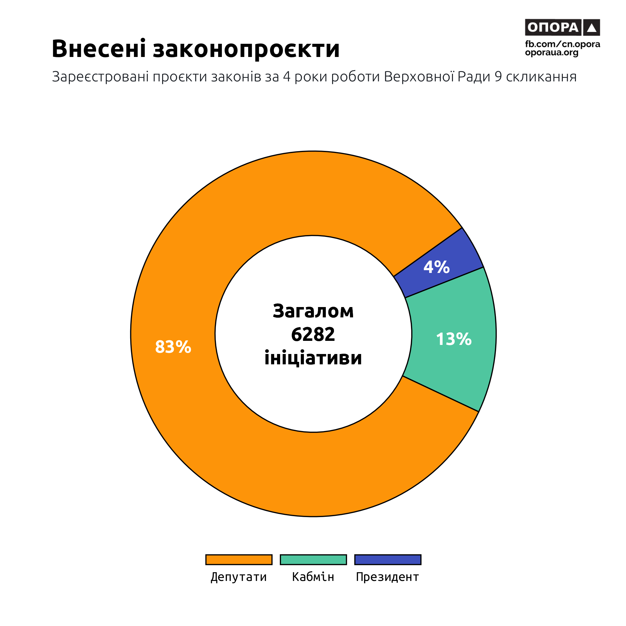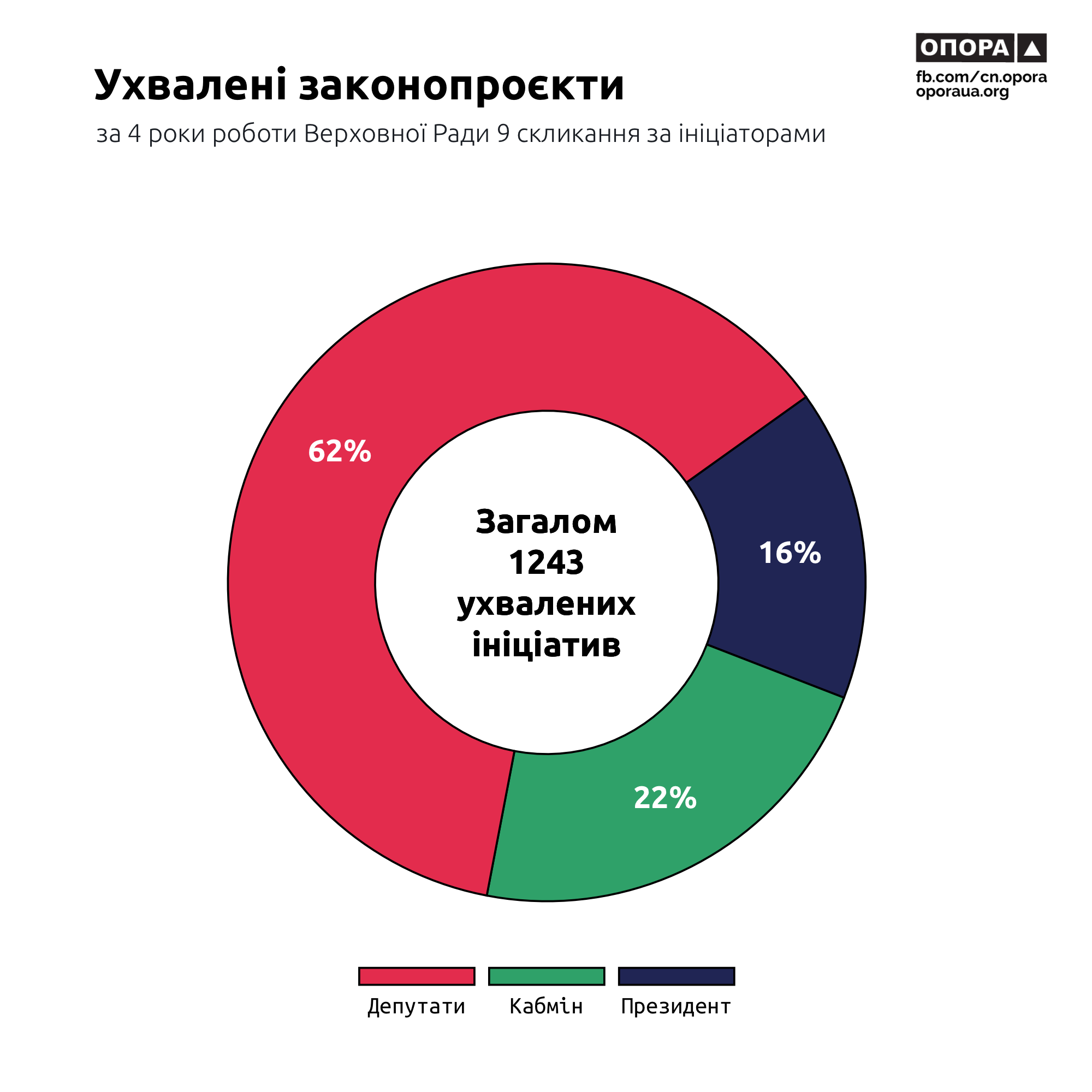 За 4 роки роботи ІХ скликання парламенту кожна п’ята законопроєктна ініціатива була успішно проголосована. У попередньому скликанні цей показник був нижчим, адже парламент підтримував лише кожен восьмий законопроєкт. Примітно, що порівняно з попереднім підсумком ОПОРИ (за три роки роботи парламенту), Верховна Рада ІХ скликання збільшила показник ефективності прийняття законопроєктів на 3%.