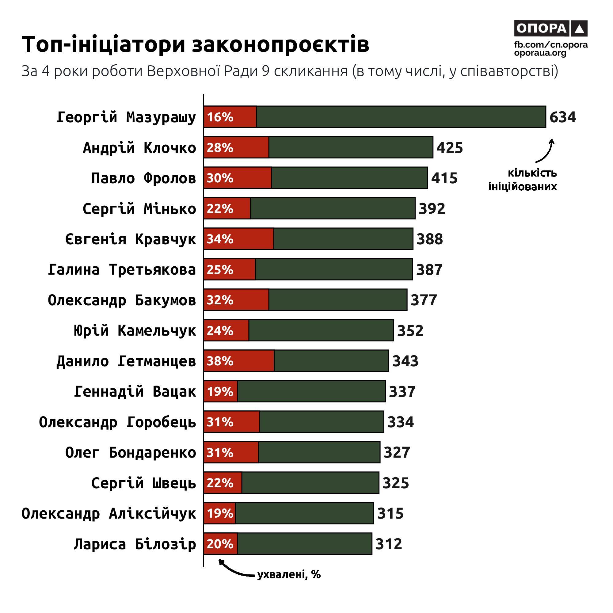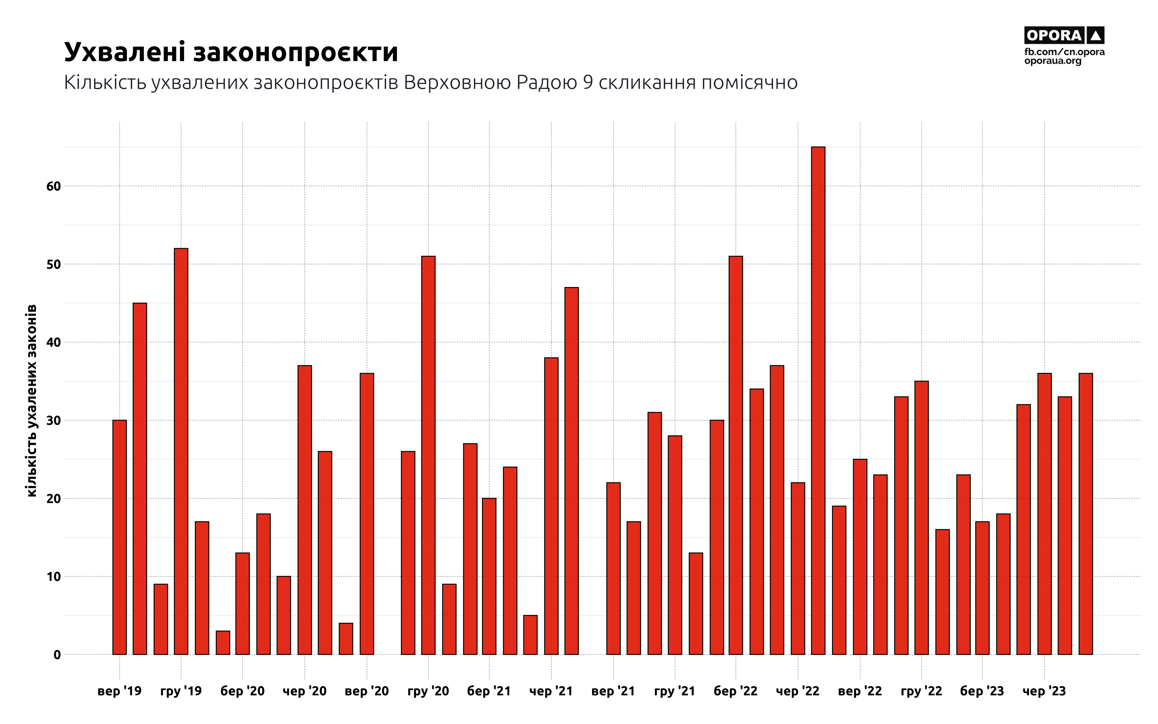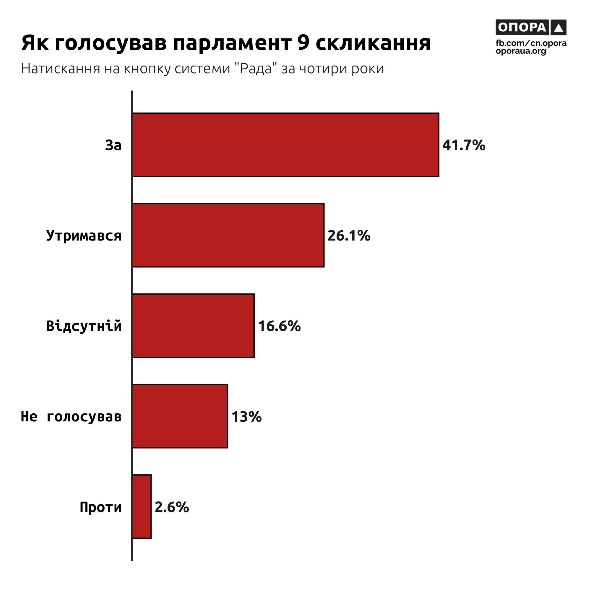 За 4 роки роботи ІХ скликання парламенту кожна п’ята законопроєктна ініціатива була успішно проголосована. У попередньому скликанні цей показник був нижчим, адже парламент підтримував лише кожен восьмий законопроєкт. Примітно, що порівняно з попереднім підсумком ОПОРИ (за три роки роботи парламенту), Верховна Рада ІХ скликання збільшила показник ефективності прийняття законопроєктів на 3%.