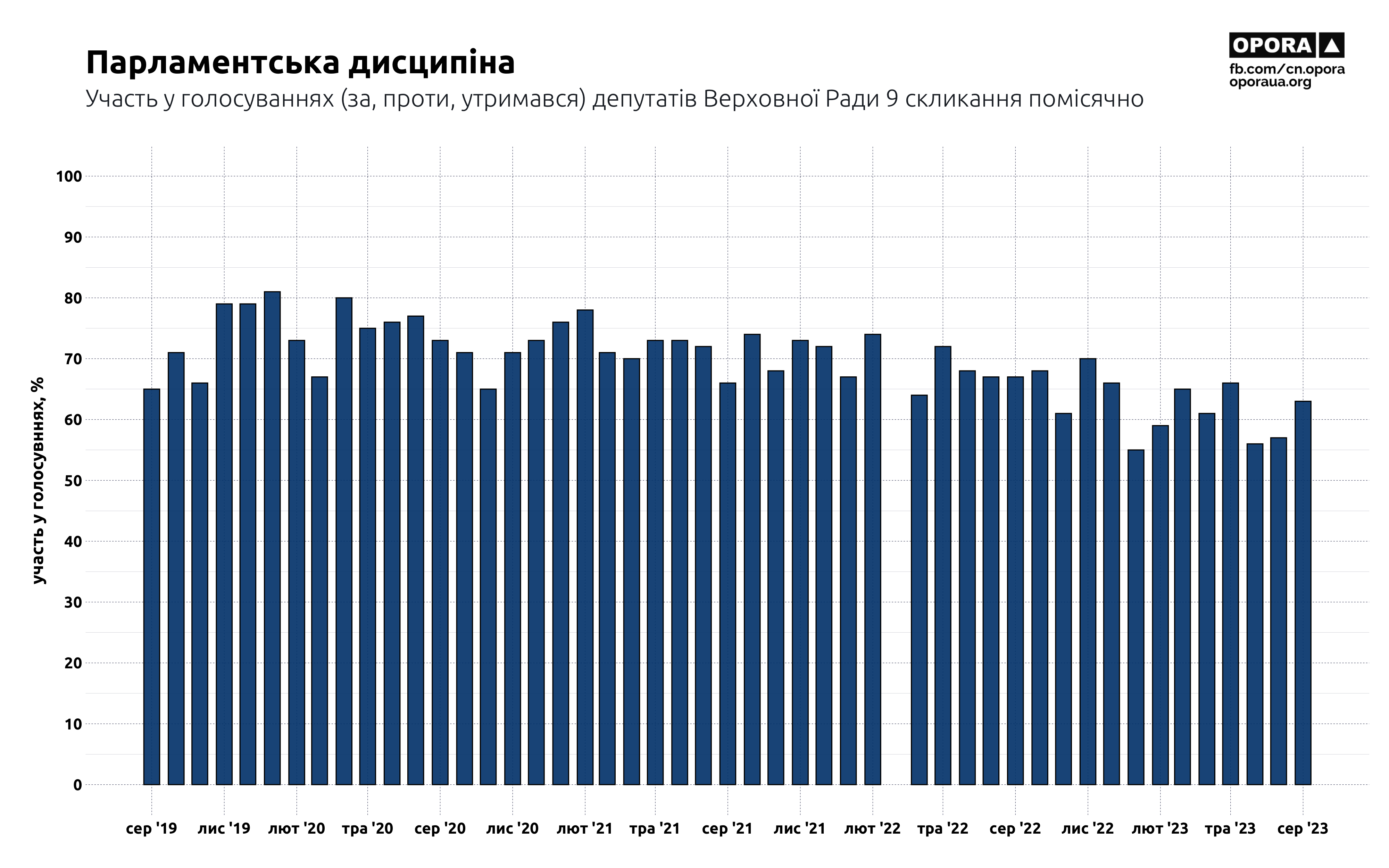 Загалом парламентська дисципліна і до, і після початку повномасштабного вторгнення перебуває приблизно на одному рівні — 71–72% відвіданих засідань. Найбільш відповідальними депутати були у січні 2020 року — 81%. Втім, вже у 2023 році парламентарі почали бути набагато менш дисциплінованими: у січні лютому, червні та липні відвідуваність була меншою за 60%.