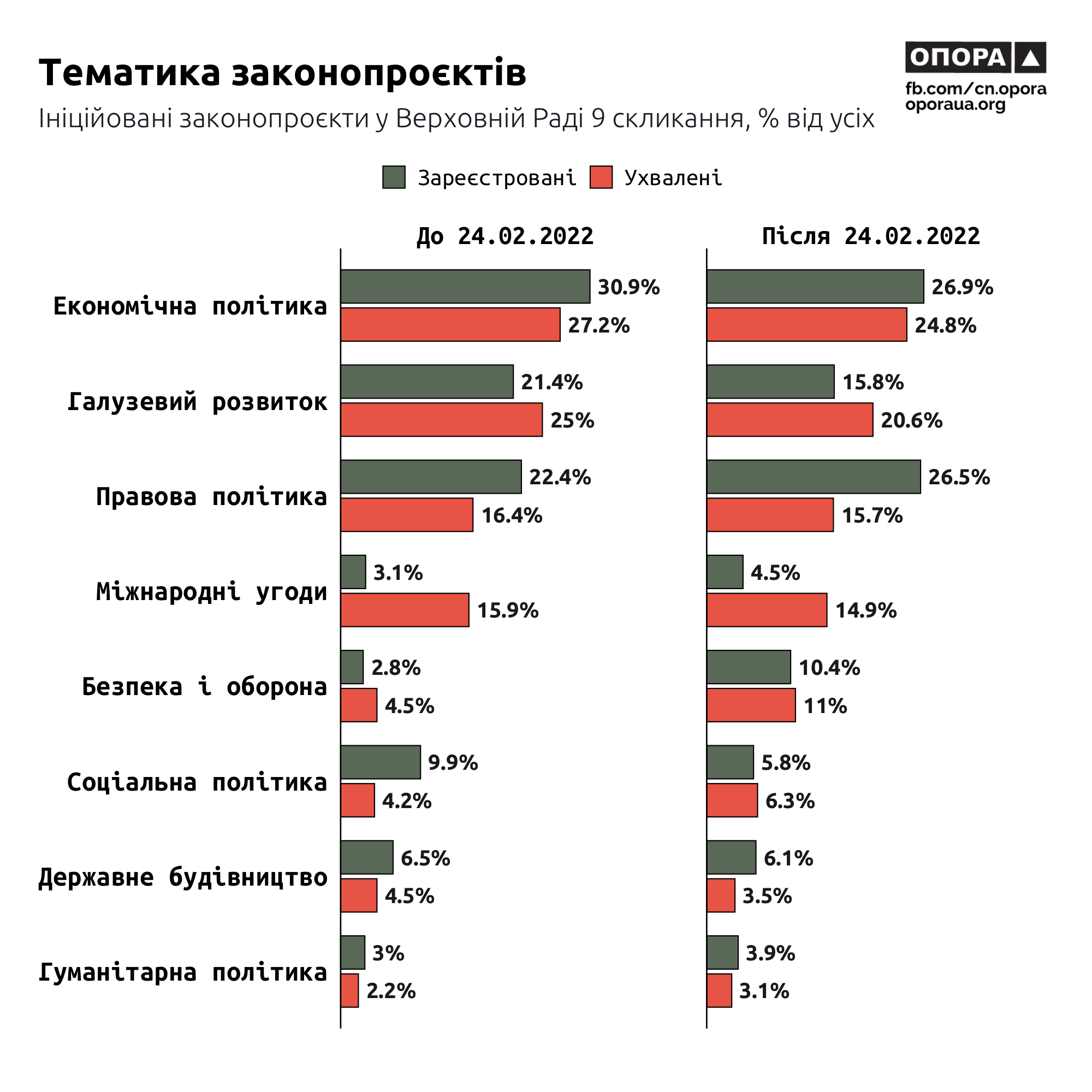 Після 24 лютого 2022 року також значно зросла частка ухвалених ініціатив у сфері безпеки й оборони — до 11%. Раніше вона перебувала на рівні 4,5%.