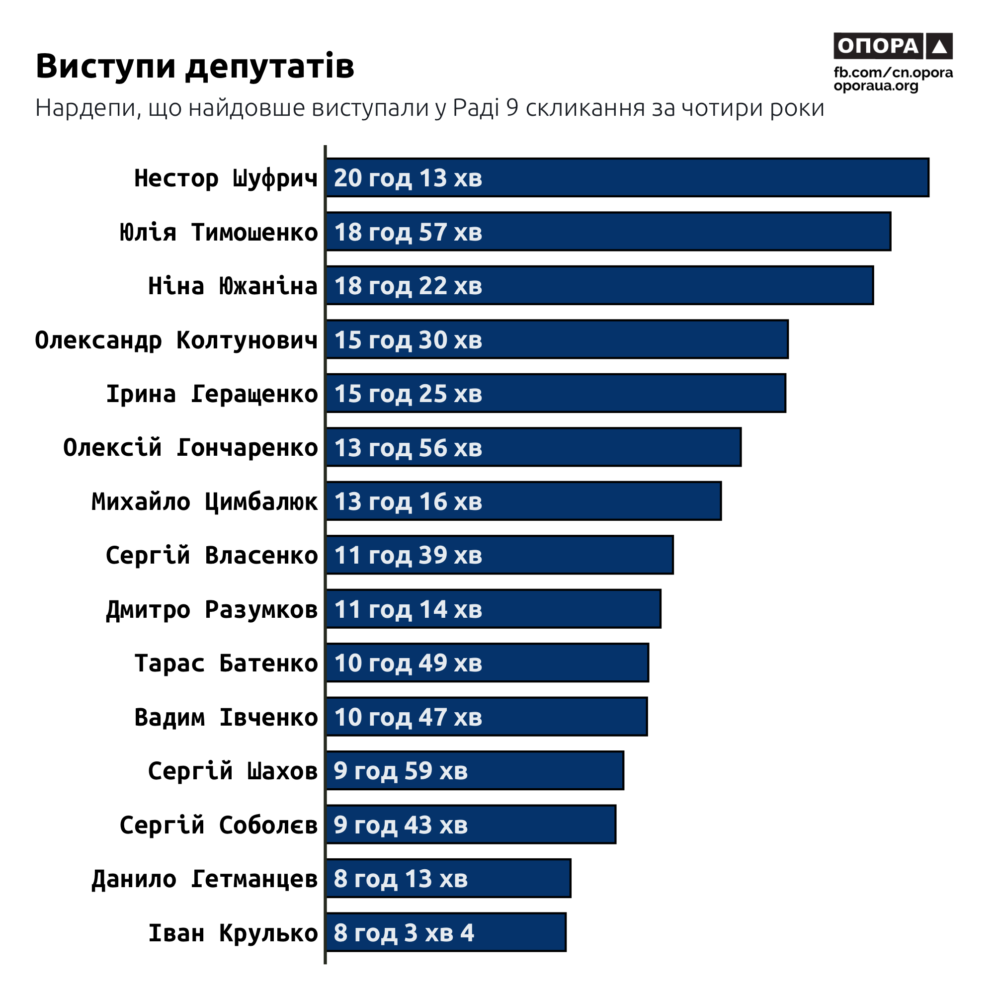Найбільше — аж 900 разів — виступав Нестор Шуфрич (група "Плтаформа за життя та мир"), загалом “наговоривши” аж 19 годин 24 хвилини. Друге місце посіла лідерка ВО “Батьківщина” Юлія Тимошенко — 18 годин 57 хвилин. На третьому місці — депутатка від “Європейської Солідарності” Ніна Южаніна.
