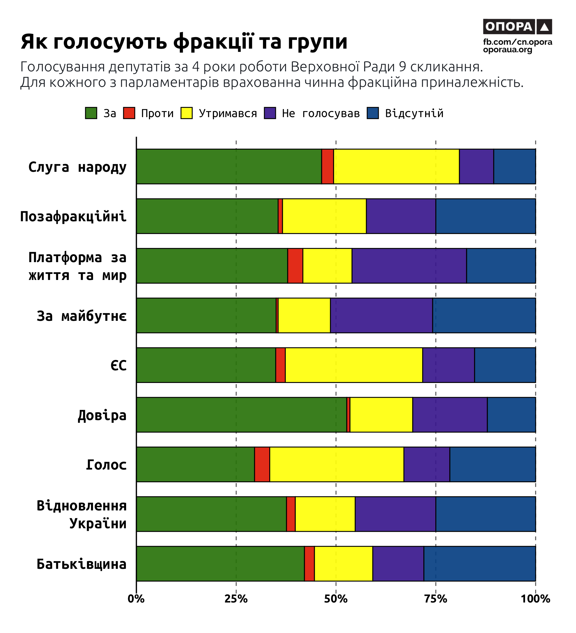 Найактивніше голосують “за” члени групи “Довіра” — у 53% випадків, а депутати від “Слуги народу” — у 46%. Найменше натискають на кнопку “за” члени "Європейської Солідарності" та групи “За майбутнє” — по 35%.