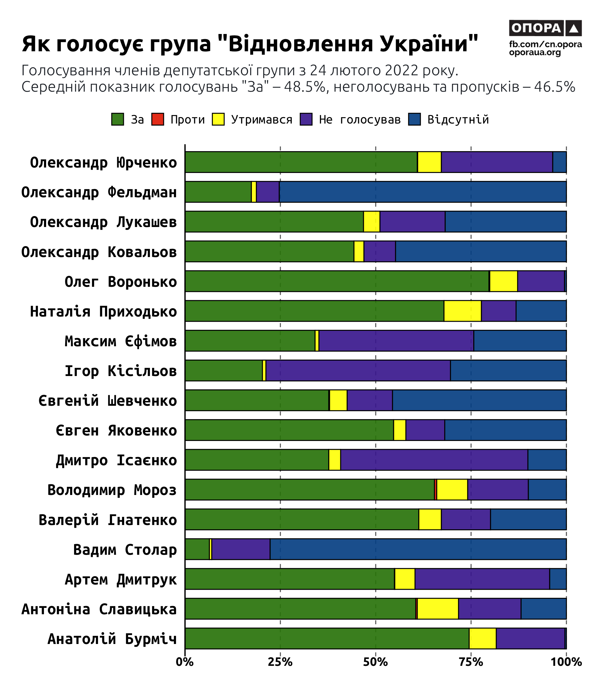 Аналізуючи голосування груп “Відновлення України” та “Платформа за життя та мир”, можна відзначити, що їхні члени у майже половині випадків підтримують законодавчі ініціативи, що, зрештою, іноді навіть допомагає набирати потрібні голоси “за” у сесійній залі. Примітно, що без ексчленів "ОПЗЖ" окремі закони справді не можна було б ухвалити.