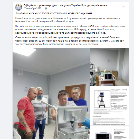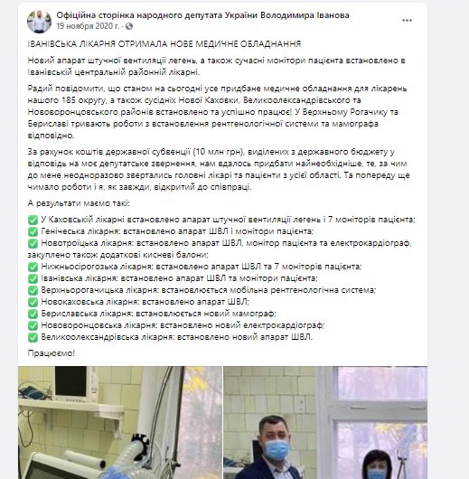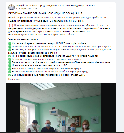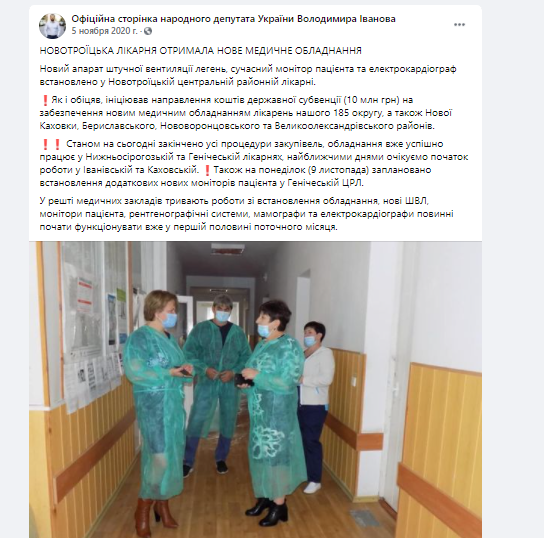 Володимир Іванов нардеп зі 185 округу також інформує про субвенції. “Продовжую інформувати про використання коштів державної субвенції (10 млн грн), направлених за моїм депутатським поданням на закупівлю нового медичного обладнання для лікарень нашого 185 округу, а також Нової Каховки, Бериславського, Нововоронцовського та Великоолександрівського районів” ‒ зазначається у повідомленні.