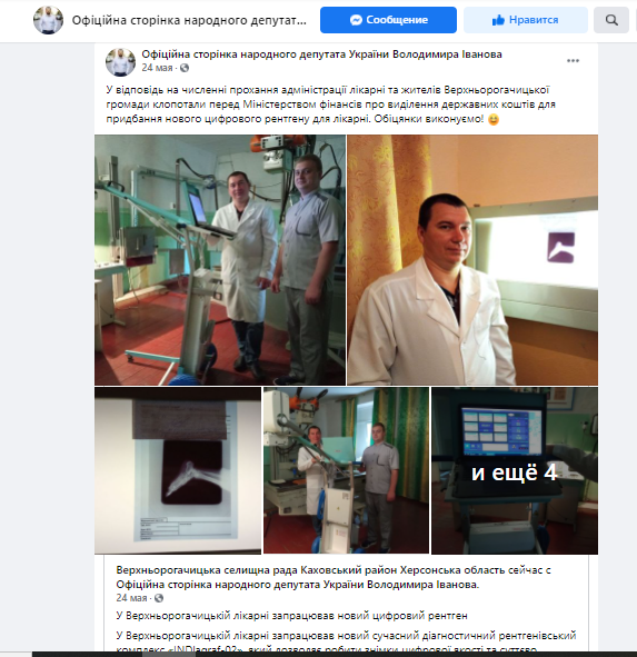 24 травня 2021 року в ще одному пості на Фейсбуці він зазначив: “У відповідь на численні прохання адміністрації лікарні та жителів Верхньорогачицької громади підготував клопотання перед Міністерством фінансів про виділення державних коштів для придбання нового цифрового рентгену для лікарні. Обіцянки виконуємо!”
