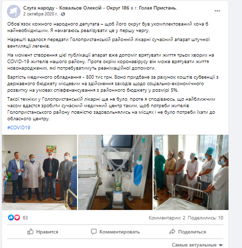 “На момент створення цієї публікації апарат вже допоміг врятувати життя трьох хворих на COVID-19 жителів нашого району. Проте крім коронавірусу він може врятувати життя новонароджених, які потребуватимуть реанімаційної допомоги. Вартість медичного обладнання ‒ 800 тис грн. Воно придбане за рахунок коштів субвенції з державного бюджету місцевим на здійснення заходів щодо соціально-економічного розвитку на умовах співфінансування з районного бюджету у розмірі 5%” ‒ пише парламентар.