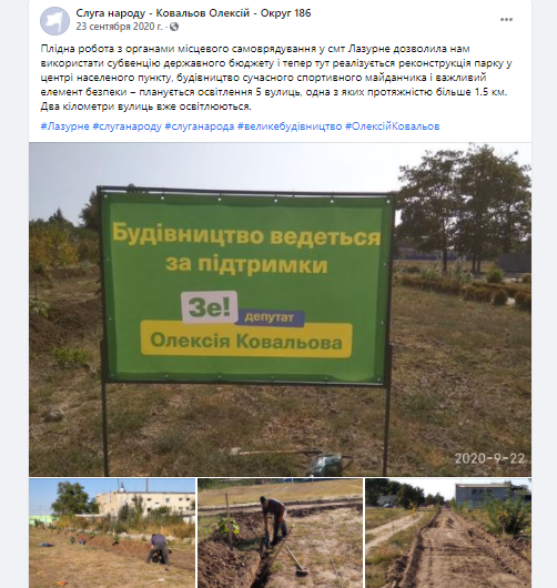 Олексій Ковальов 23 вересня 2020 року публікує світлину на своїй фейсбук-сторінці, де видно, що на території проводяться роботи і встановлено банер “Будівництво ведеться за підтримки Зе депутат Олексій Ковальов”.
