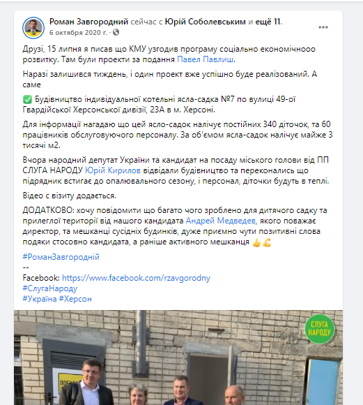 “Наразі залишився тиждень, і один проект вже успішно буде реалізований. А саме Будівництво індивідуальної котельні ясла-садка №7 по вулиці 49-ої Гвардійської Херсонської дивізії, 23А в м. Херсоні. Для інформації нагадаю що цей ясло-садок налічує постійних 340 діточок, та 60 працівників обслуговуючого персоналу. За об’ємом ясла-садок налічує майже 3 тисячі м2. Вчора народний депутат України та кандидат на посаду міського голови від ПП СЛУГА НАРОДУ Юрій Кирилов відвідали будівництво та переконались що підрядник встигає до опалювального сезону, і персонал, діточки будуть в тепл” ‒ йдеться в повідомленні.