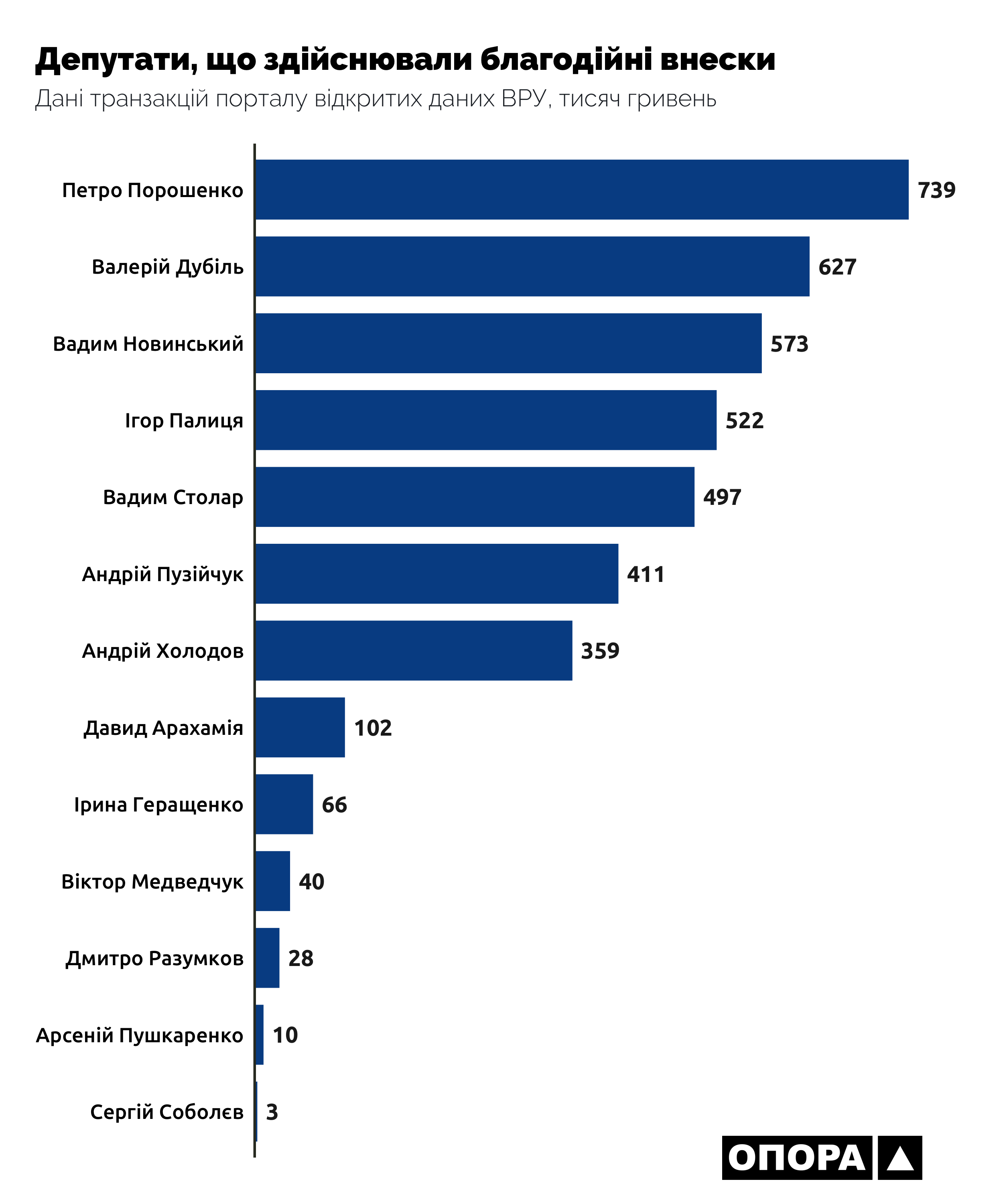 Так, Петро Порошенко (Європейська Солідарність) здійснив 14 благодійних внесків до Благодійного фонду Петра Порошенка на загальну суму 739 тисяч гривень.