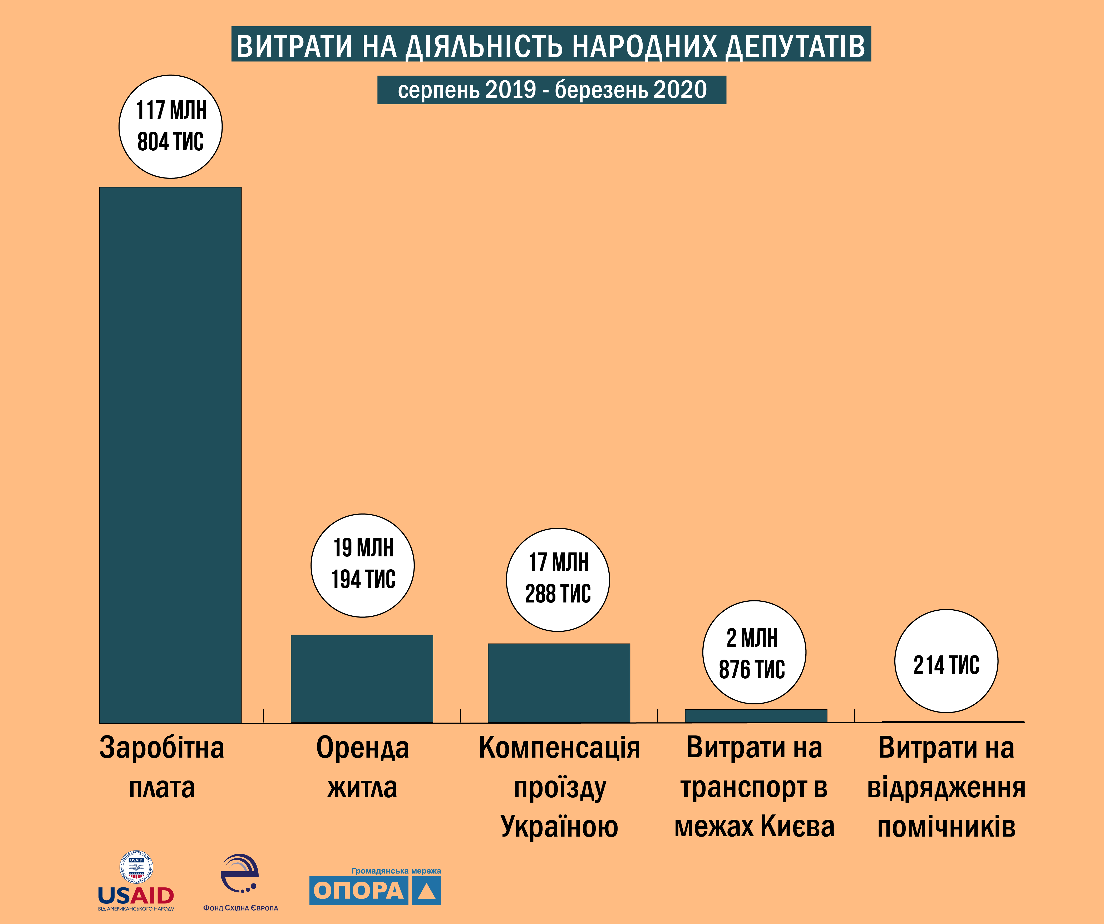 157 388 786 грн витрачено на народних депутатів Верховної Ради України 9 скликання у період з 29 серпня 2019 року до 31 березня 2020 року. Найбільше коштів виплачено для парламентарів у якості зарплати і компенсовано як вартість оренди житла. Таким є один із результатів аналізу ОПОРОЮ витрат на депутатський корпус за перші 7 місяців його роботи.