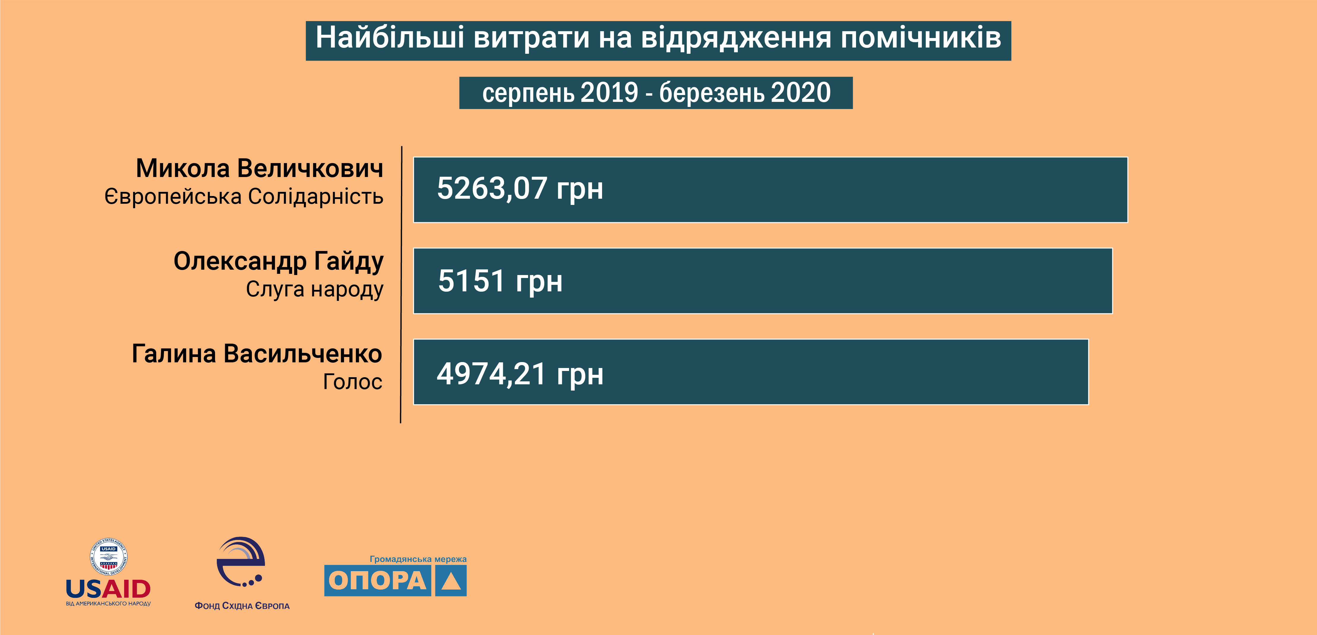 Щодо компенсації коштів на відрядження для помічників-консультантів депутатів, то на ці потреби було виділено 214 521, 31 грн, і скористалися такою компенсацією менш як 90 парламентарів. Найбільшу суму компенсації отримали Микола Величкович (фракція Політичної партії «Європейська Солідарність») – 5 263,07 грн, Олександр Гайду (фракція Політичної партії «Слуга Народу») – 5 151 грн та Галина Васильченко (фракція Політичної партії «Голос») – 4 974,21 грн.