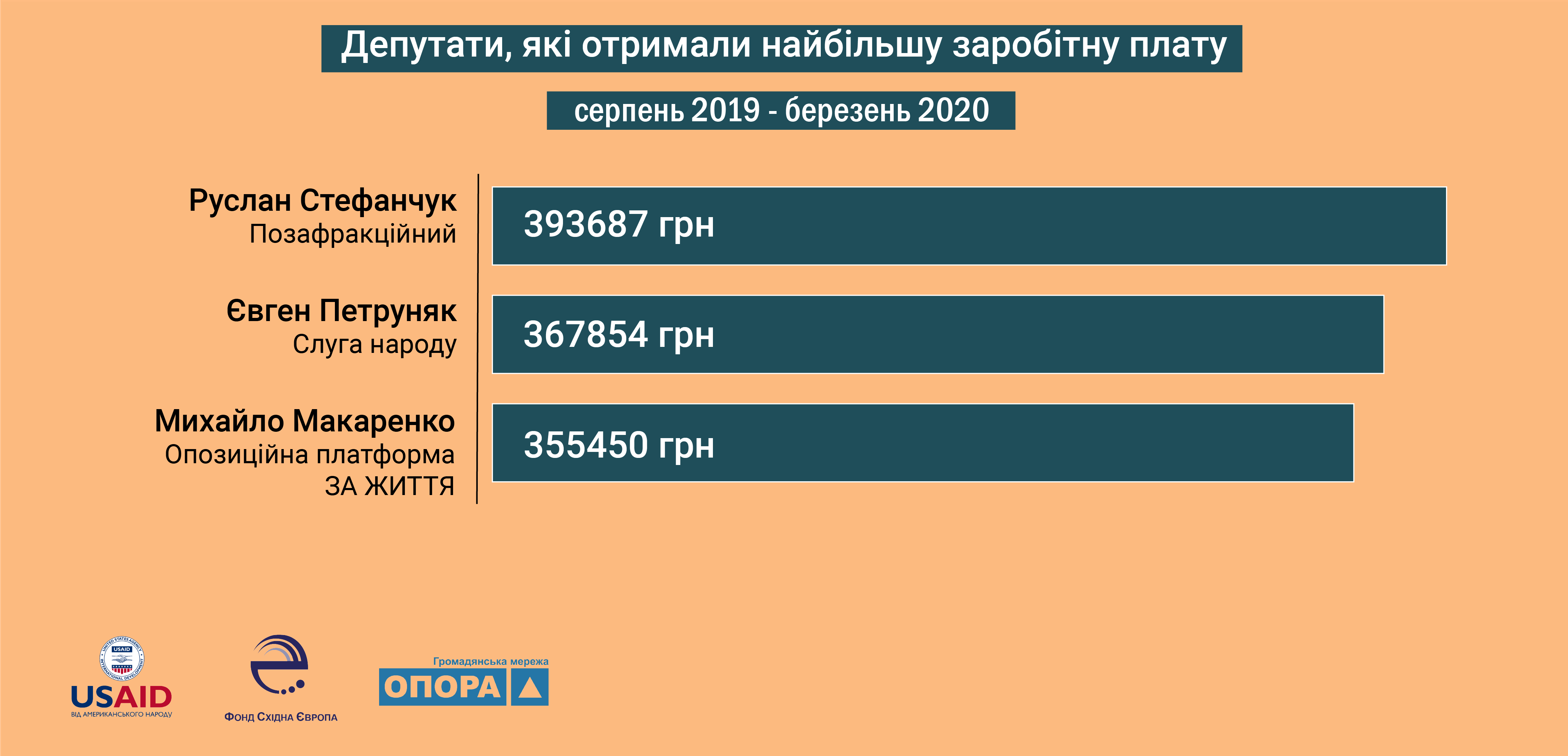 Найбільшу зарплату за період з 29 серпня 2019 року до 31 березня 2020 року отримав перший заступник голови Верховної Ради України Руслан Стефанчук (позафракційний) 393 687,58 грн, народний депутат Євген Петруняк (фракція Політичної партії «Слуга Народу») 367 854,8 грн та народний депутат Михайло Макаренко (фракція Політичної партії «Опозиційна платформа – за життя») - 355 450,96 грн.