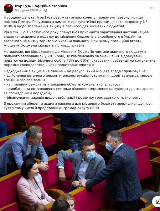 Для прикладу, 9 грудня з проханням зберегти акциз з пального для місцевого бюджету до народного депутата зверталися представники громад округу №19. У результаті нардеп запропонував напрацьовані правки до відповідного законопроекту. 17 лютого у Міністерстві охорони здоров’я відбулася робоча зустріч нардепа Ігоря Гузя, Володимир-Волинського міського голови Ігоря Пальонки, керівниці Володимир-Волинського ТМО Тетяни Ващук з першою заступницею міністра охорони здоров’я Іриною Садов’як. Обговорили імовірність того, що Володимир-Волинське ТМО стане опорною лікарнею. 16 квітня нардеп Ігор Гузь, Нововолинський міський голова Борис Карпус та Володимир-Волинський міський голова Ігор Пальонка провели робочу зустріч з Міністром молоді та спорту України Вадимом Гутцайтом. Питання, які обговорили під час зустрічі, стосувалися розвитку спортивної інфраструктури у двох місцевих громадах та виділення коштів з державного бюджету на відповідні потреби галузі.