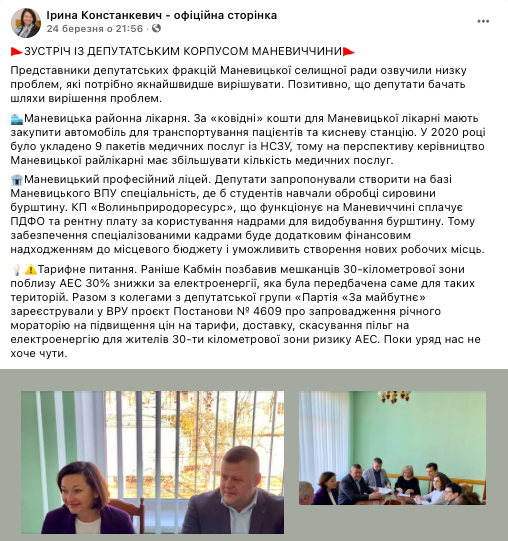 Для прикладу, 15 січня на сторінці Ірини Констанкевич у мережі Facebook з’явився допис про те, що напередодні ряд народних депутатів зареєстрували проект Постанови про вжиття невідкладних заходів, спрямованих на повернення пільгового тарифу на електроенергію для населення. Таке рішення супроводжувалося ухваленням місцевими радами, як Волинською обласною, Луцькою районною, Маневицькою селищною та іншими, звернень до Верховної Ради України, Президента України, Уряду щодо недопущення зростання тарифів для населення.