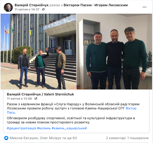 На сторінці народного депутата України із фракції «Слуга народу» Валерія Стернійчука у мережі Facebook було виявлено три дописи, у яких йдеться про його співпрацю в рамках депутатських повноважень з зацікавленими сторонами на Волині. Зокрема, 26 листопада народний обранець розповів про проведення на Волині робочої зустрічі з нововобраними депутатами місцевих рад за участі голови підкомітету з питань адміністративно-територіального устрою Комітету Верховної Ради України з питань організації державної влади, місцевого самоврядування, регіонального розвитку та містобудування Віталія Безгіна, під час якої обговорювали тему децентралізації. 2 лютого на сторінці депутата було оприлюднено допис про відновлення руху через окремі міжнародні пункти пропуску на Волині на кордоні з Республікою Білорусь. У дописі йдеться, що ініціатива належала депутату Ратнівської селищної ради Юрію Данилюку. 11 квітня нардеп оприлюднив інформацію про проведення робочої зустрічі з керівником фракції «Слуга народу» у Волинській обласній раді Ігорем Лісовським та головою Камінь-Каширської територіальної громади Віктором Пасем, під час якої обговорювалось питання розбудови спортивної, освітньої та культурної інфраструктури в громаді за новим планом просторового розвитку.