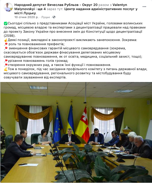 Нардеп навів декілька позитивних прикладів активного залучення керівників органів місцевого самоврядування до засідань комітету і підкомітету Верховної Ради України. Зокрема, 17 грудня 2019 року голови Боратинської, Зимненської, Любомльської та Гірко-Полонківської територіальних громад брали участь у засіданні підкомітету щодо стану місцевих фінансів України в контексті їх доходів та витрат. Також 16 лютого 2020 року представники Луцької районної ради взяли участь у спільному засіданні з членами Комітету Верховної Ради з питань організації державної влади, заступником міністра Міністерства розвитку громад та територій Вячеслава Негоди, під час якого обговорювалось питання розробки пропозицій щодо ефективного функціонування укрупнених районів.