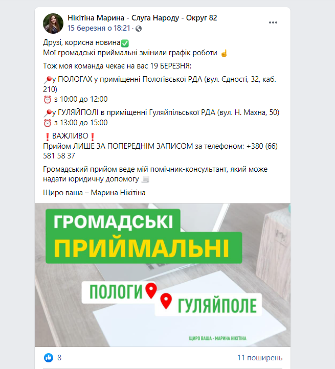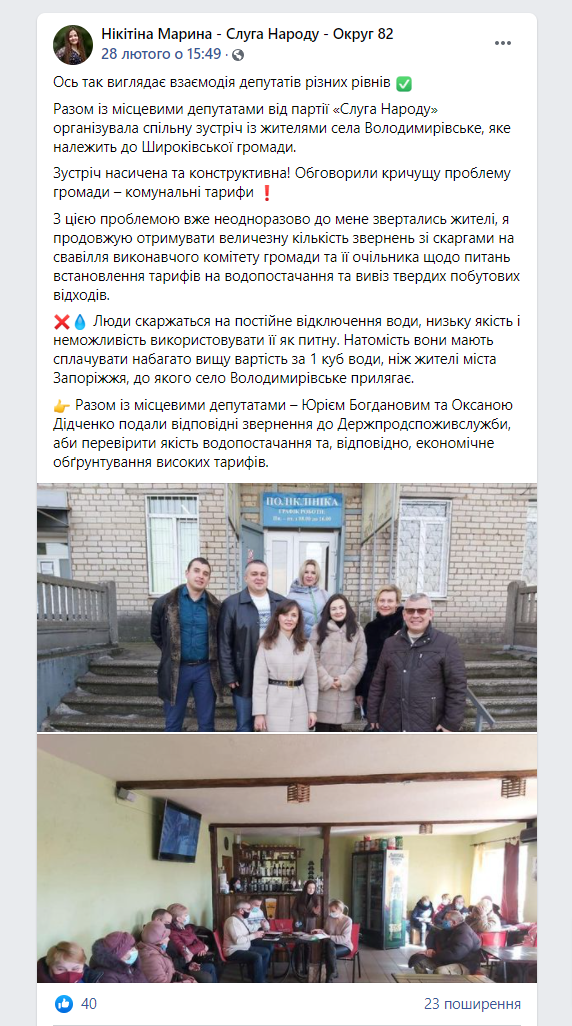 Марина Нікітіна, обрана в окрузі № 82, членкиня депутатської фракції «Слуга народу» та Комітету Верховної Ради України з питань аграрної та земельної політики. У відкритих джерелах висвітлена участь депутатки в засіданнях комітету на прикладі протоколів та стенограм, іншої інформації про її активність в цьому органі не подана. Натомість на своїй сторінці у Facebook Марина Нікітіна інформує про зміни графіку роботи у своїх громадських приймальнях, зустріч із жителями села Володимирівське Широківської громади Запорізької області тощо.
