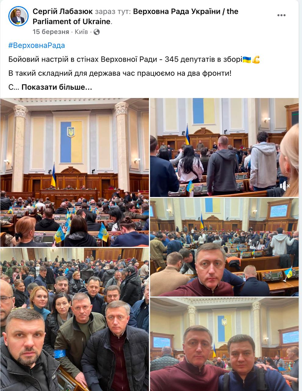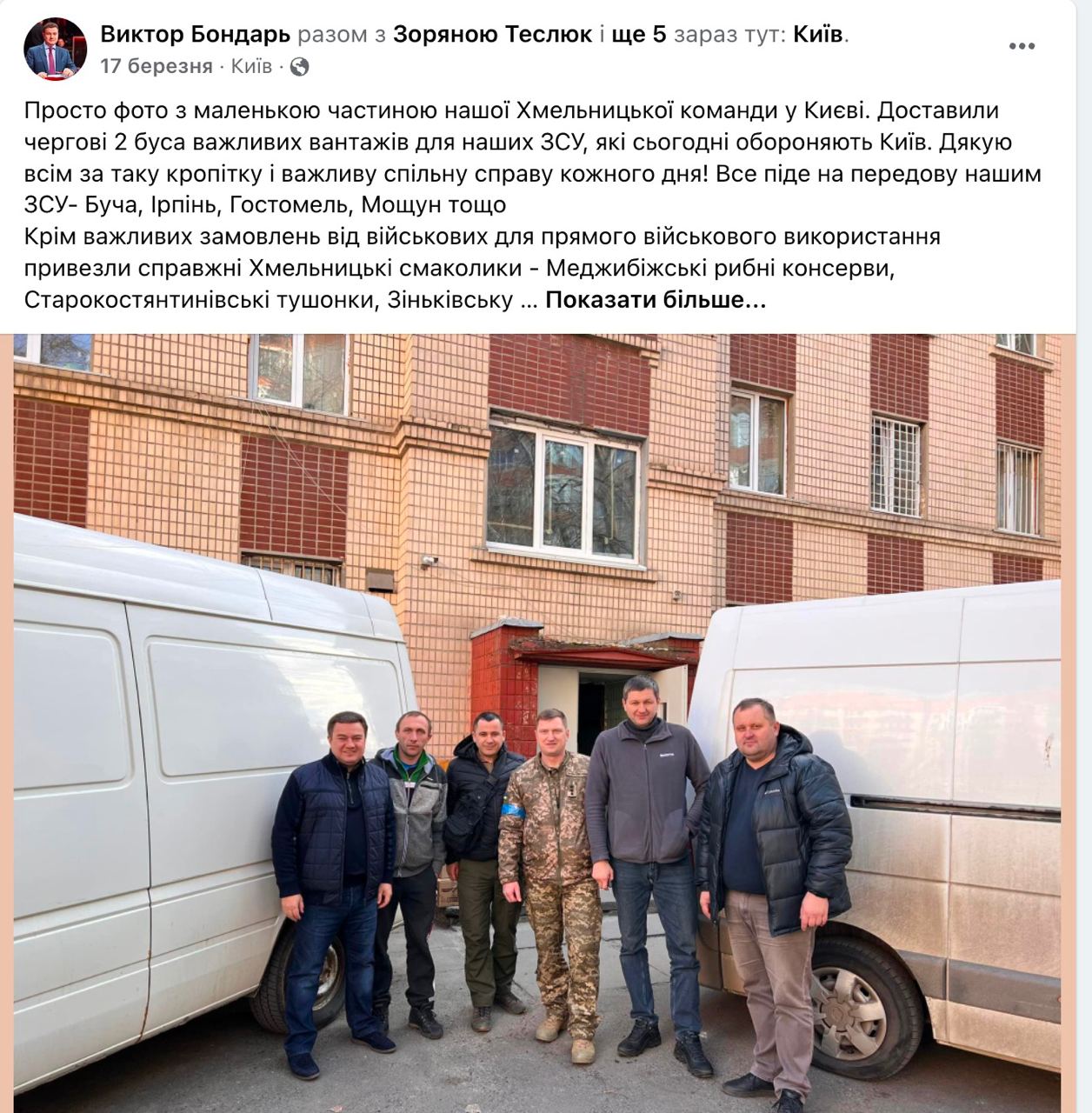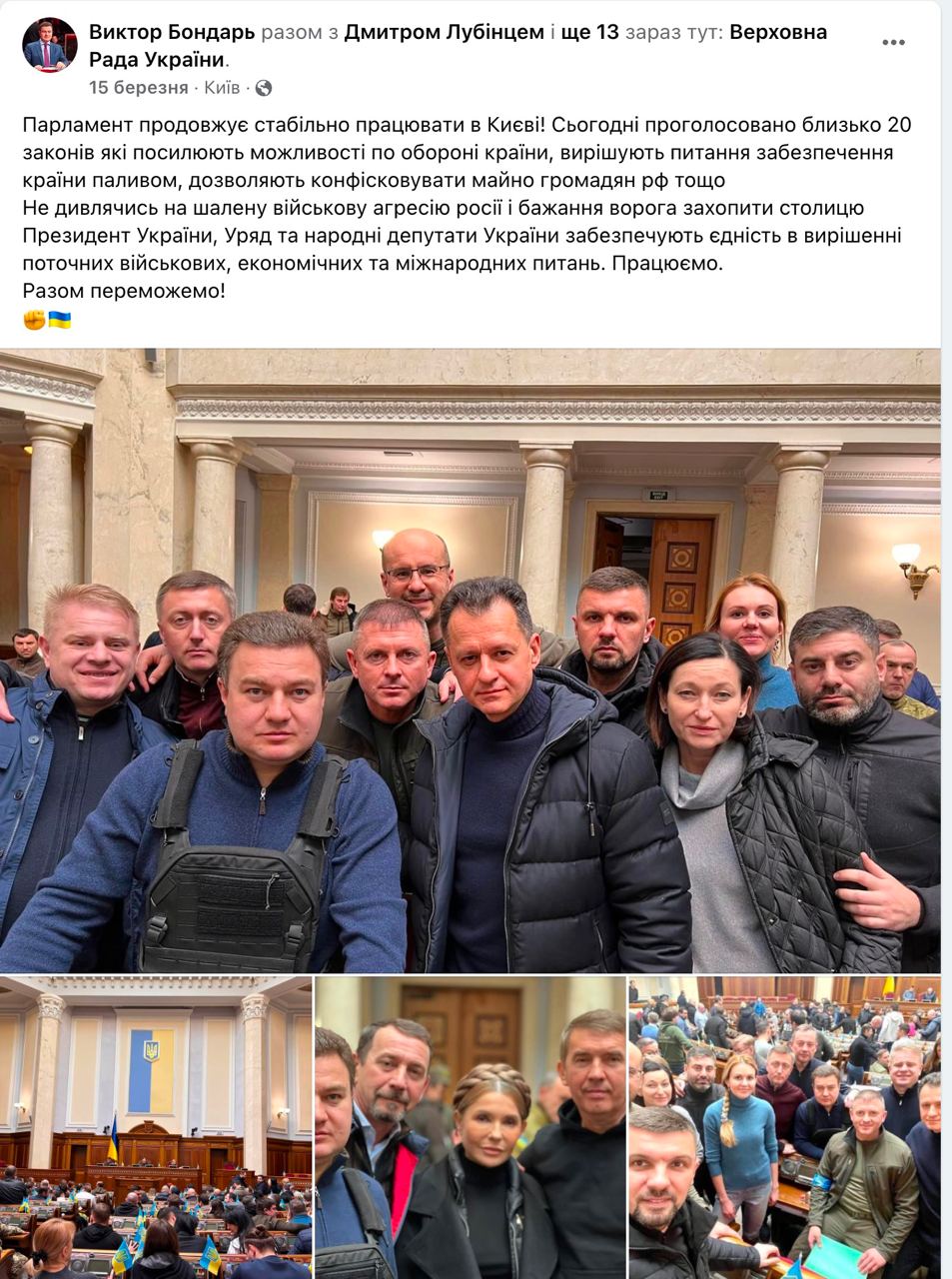 Віктор Бондар (виборчий округ №191), співголова депутатської групи «Партія «За майбутнє», перший від початку повномасштабного вторгнення допис у Facebook зробив 26 лютого. Нардеп коротко прозвітував про перші три дні оборони.