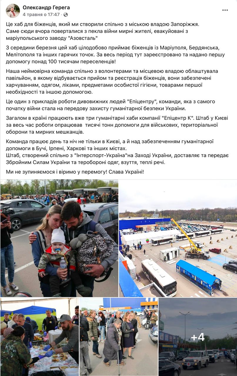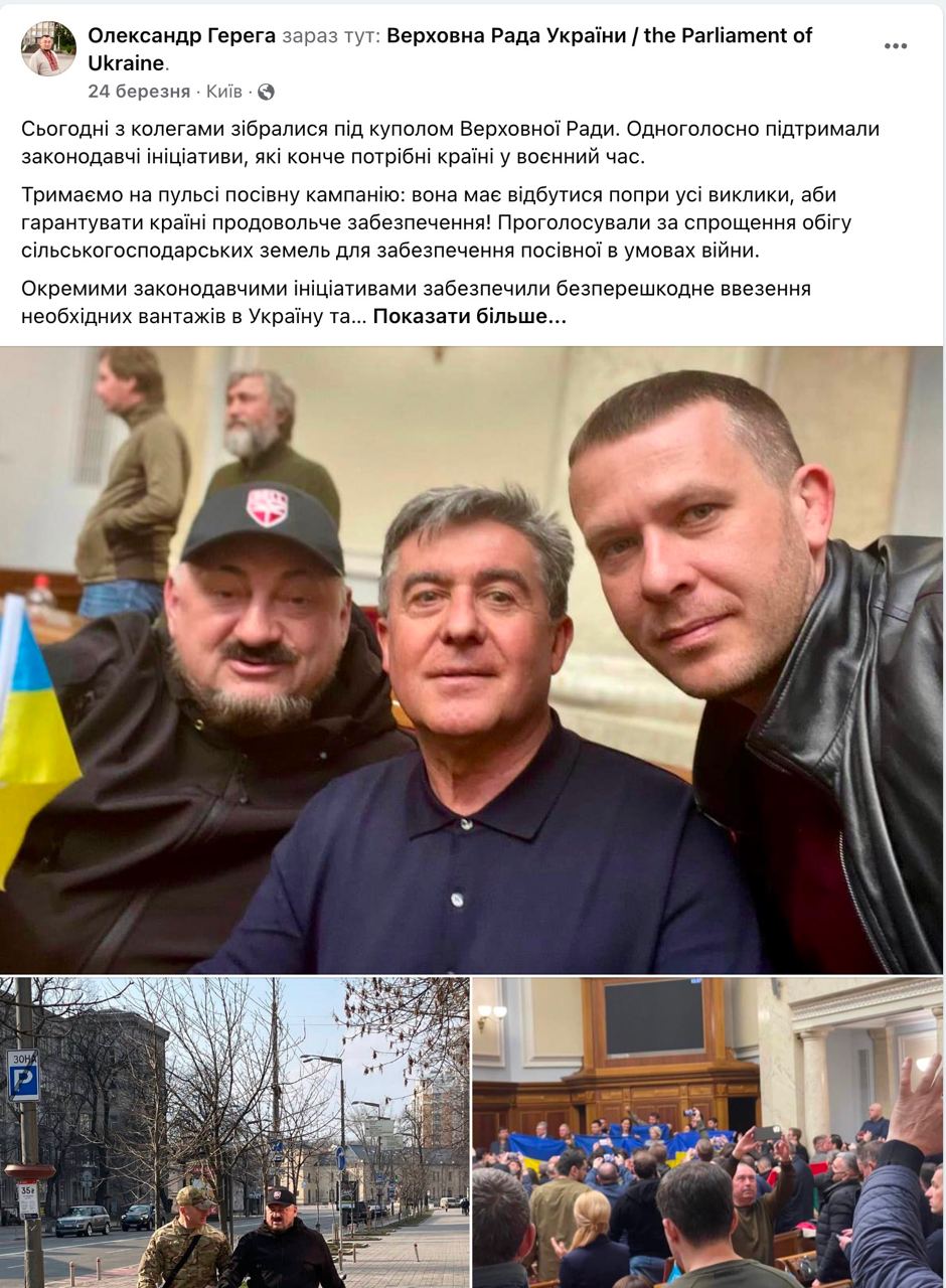 Олександр Герега (виборчий округ №192), що також належить до депутатської групи «Партія «За майбутнє», перший допис від початку повномасштабного вторгнення на своїй офіційній сторінці в Facebook розмістив 3 березня. Він повідомив про створення гуманітарного штабу компанії «Епіцентр», власником якої є, та діяльність цього штабу. Пізніше народний обранець інформував підписників сторінки про гарячу лінію на базі Хмельницької ОВА, гуманітарний штаб.
