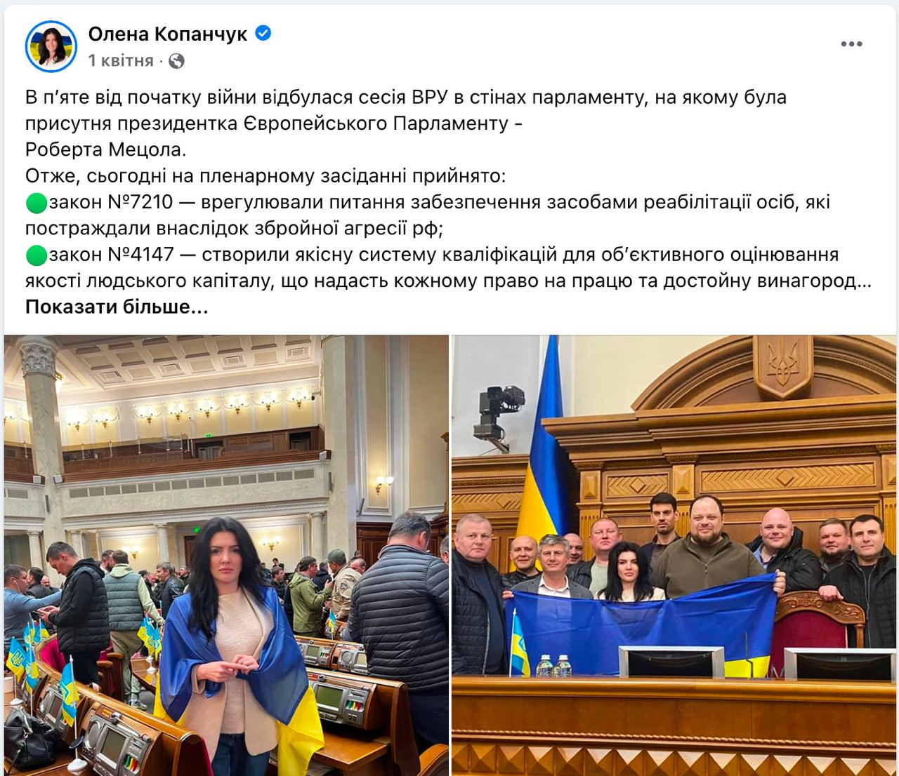 На своїй сторінці у Facebook Олена Копанчук повідомляла виборців про парламентську діяльність – ухвалені законопроєкти, зміни в законодавстві, підтримку світових лідерів, яку вони висловлювали, звертаючись до українських парламентарів.