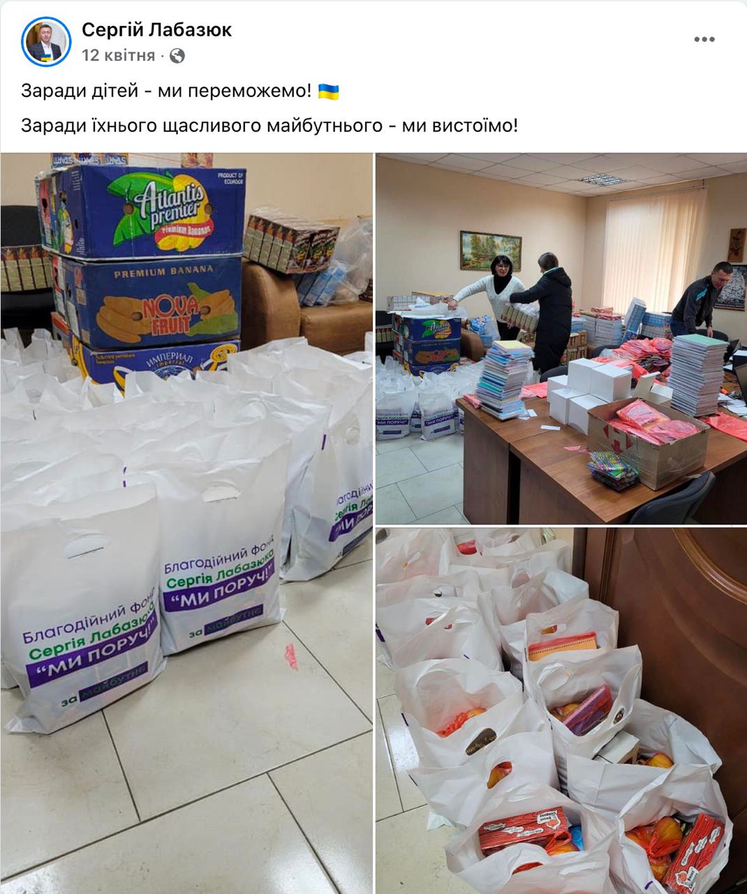 На Facebook-сторінці нардеп інформує про благодійні та волонтерські ініціативи свого благодійного фонду «Ми поруч» та Групи компаній VITAGRO (є її почесним президентом): організацію пошиття розвантажувальних жилетів для бійців, зокрема членів тероборони з населених пунктів на окрузі, виготовлення протитанкових їжаків, передачу автомобілів для захисників, доставку гуманітарної допомоги з-за кордону тощо.