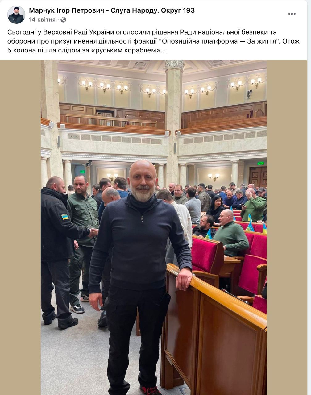 Ігор Марчук (виборчий округ №193), представник фракції партії «Слуга народу», від початку впровадження воєнного стану займається не лише депутатською, волонтерською та благодійною діяльністю, але й, як свідчить інформація на його сторінці у Facebook, записався до складу добровольчого батальйону «Дозор».