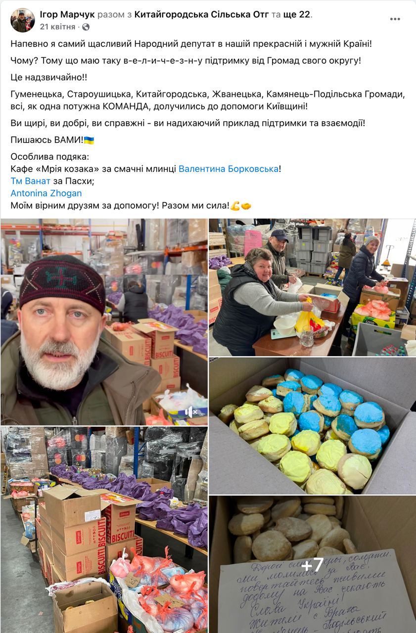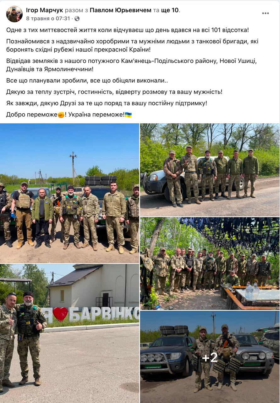 «Ми в нашому добровольчому формуванні «Дозор» не тільки захищаємо, а ще й допомагаємо людям постраждалим від орковської навали та нашим побратимам по боротьбі!» – писав Ігор Марчук 15 квітня.
