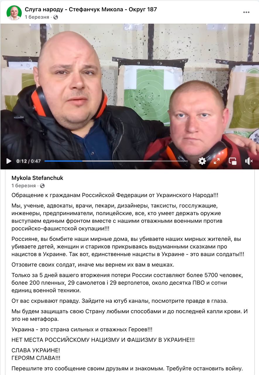Микола Стефанчук (виборчий округ №187), який входить до фракції партії «Слуга народу», у перший день повномасштабного вторгнення, 24 лютого, поширив на своїй публічній сторінці в фейсбуці звернення Президента України Володимира Зеленського. 1 березня Микола Стефанчук опублікував відео із колегою-однопартійцем Володимиром Ватрасом, теж вихідцем із Хмельниччини, проте обраним за партійними списками. Народні депутати звернулися до росіян з попередженням, що будуть боронити свою землю до останньої краплі крові, і вимагали залишити Україну.