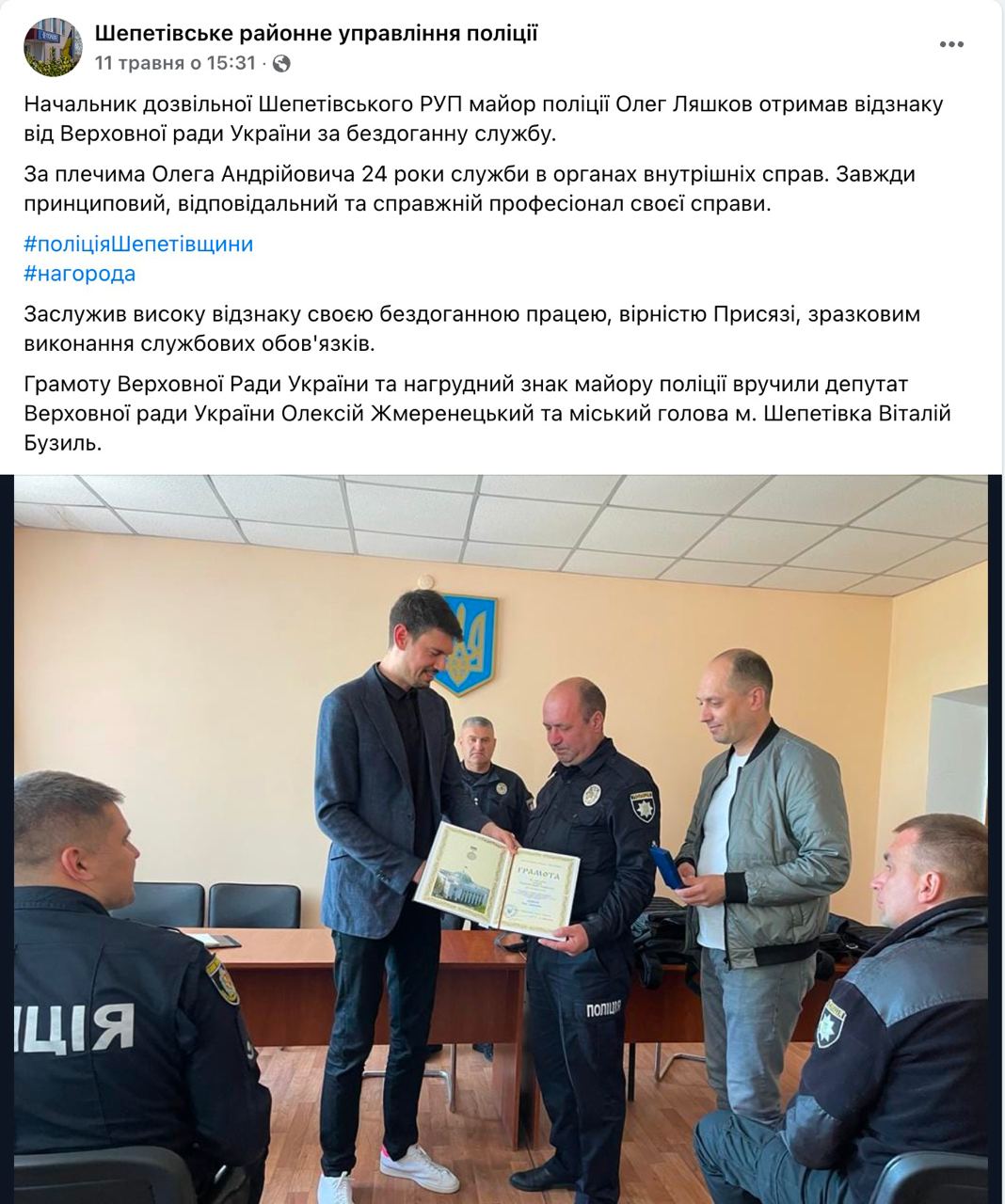Про візит депутата в округ можна довідатися з інформації на сторінці Шепетівського районного управління поліції, яке 11 травня повідомило, що Олексій Жмеренецький вручив Грамоту Верховної Ради України та нагрудний знак майору поліції.