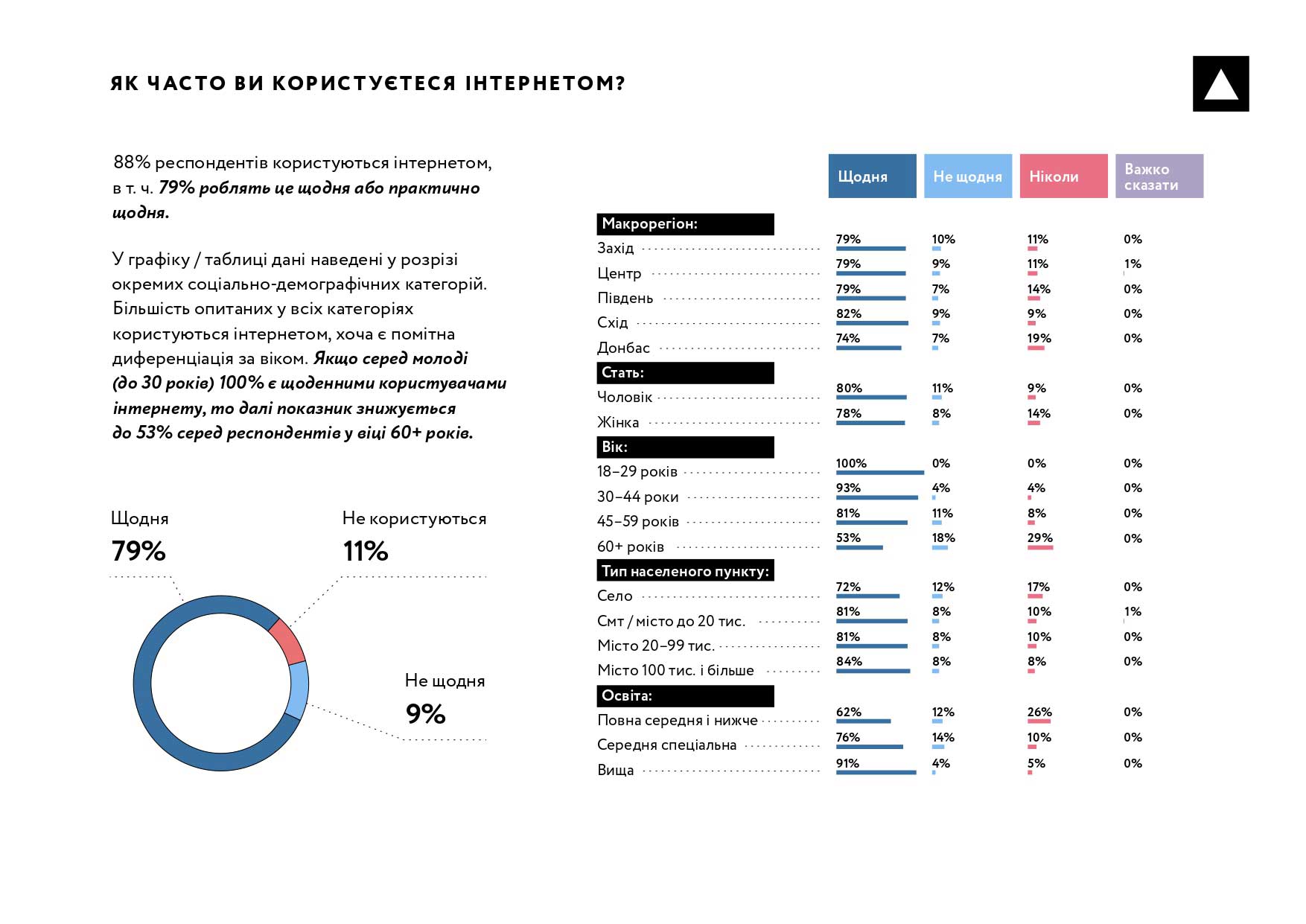 Найбільший відсоток користування Інтернетом серед молоді до 30 років —100% опитаних є щоденними користувачами всесвітньої мережі. Із віком цей показник знижується — до 53% серед респондентів віком 60+ років.