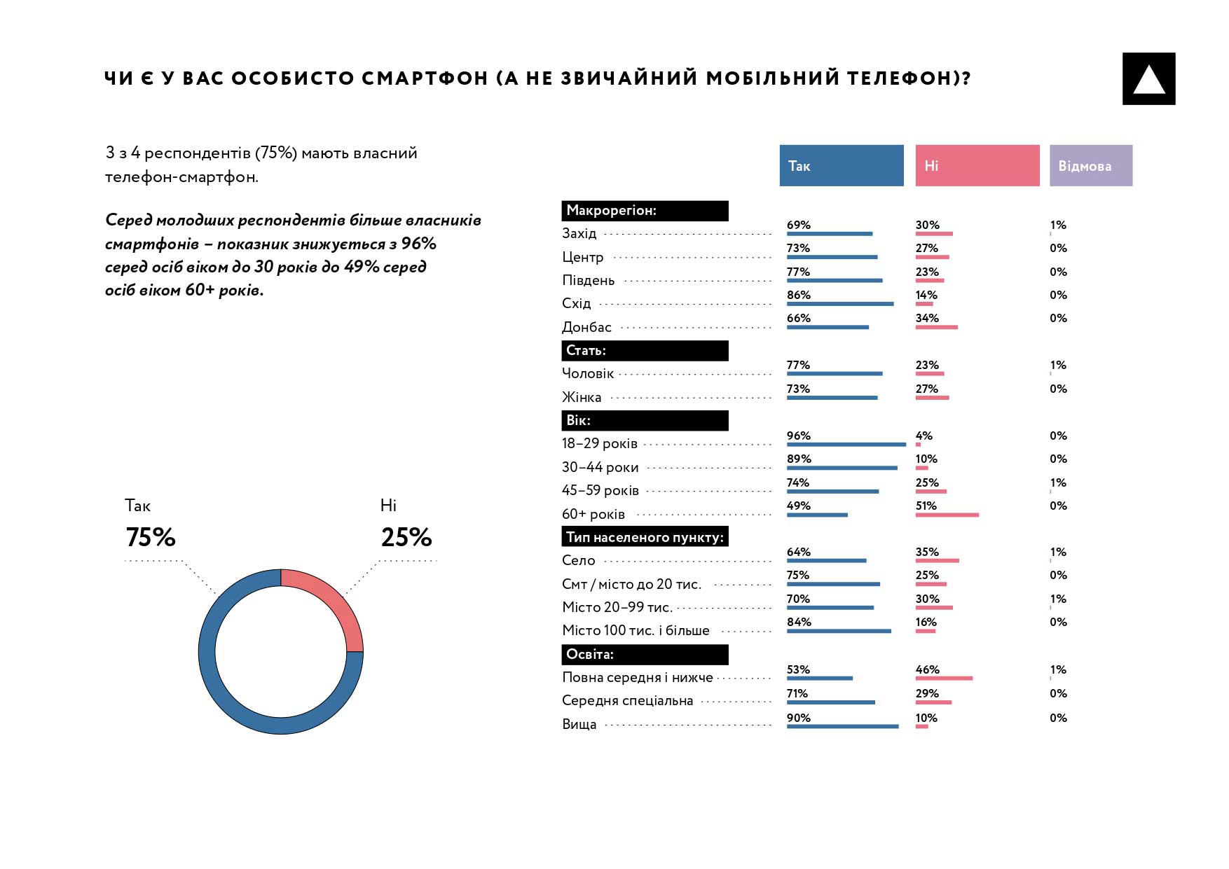 Важливо зазначити, що 3 з 4 респондентів (75%) мають особистий телефон-смартфон. Серед молодших респондентів більше власників смартфонів — показник знижується з 96% серед осіб віком до 30 років до 49% серед осіб віком 60+ років.